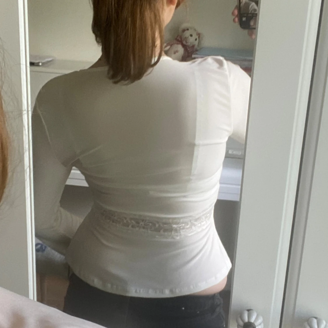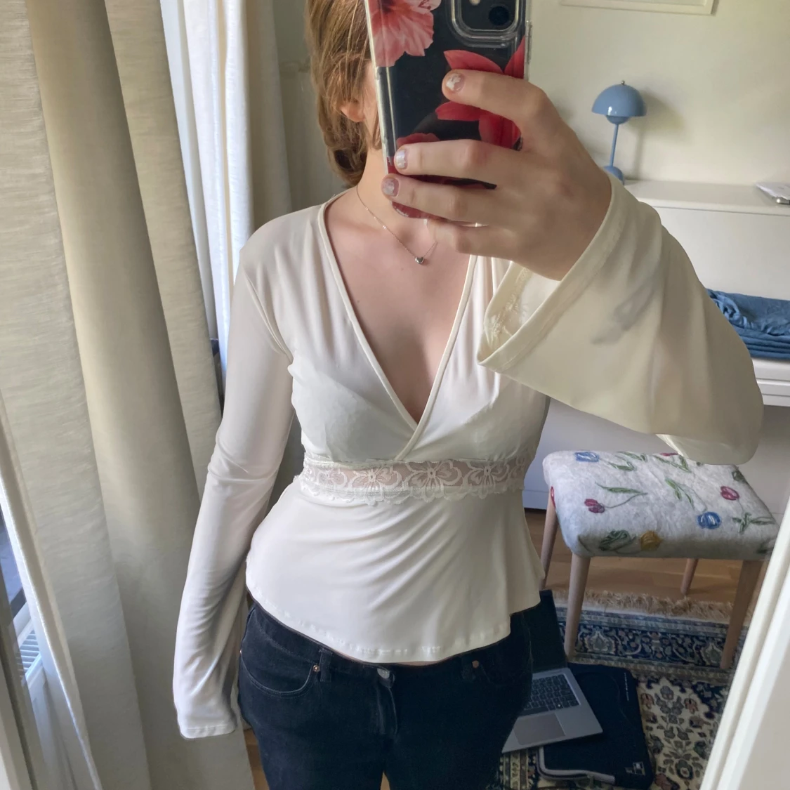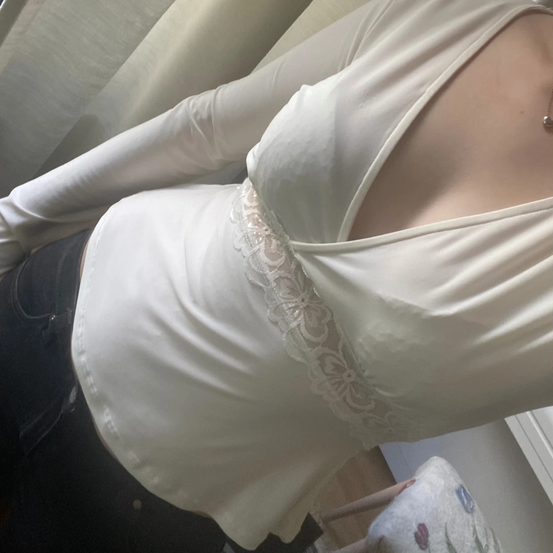 Supersnygg vit omlottopp med djup v-ringning och långa ärmar. Toppen har en bred spetskant i midjan som ger en romantisk vibe och markerar midjan snyggt. Materialet är stretchigt och lätt, perfekt för att skapa en feminin siluett.