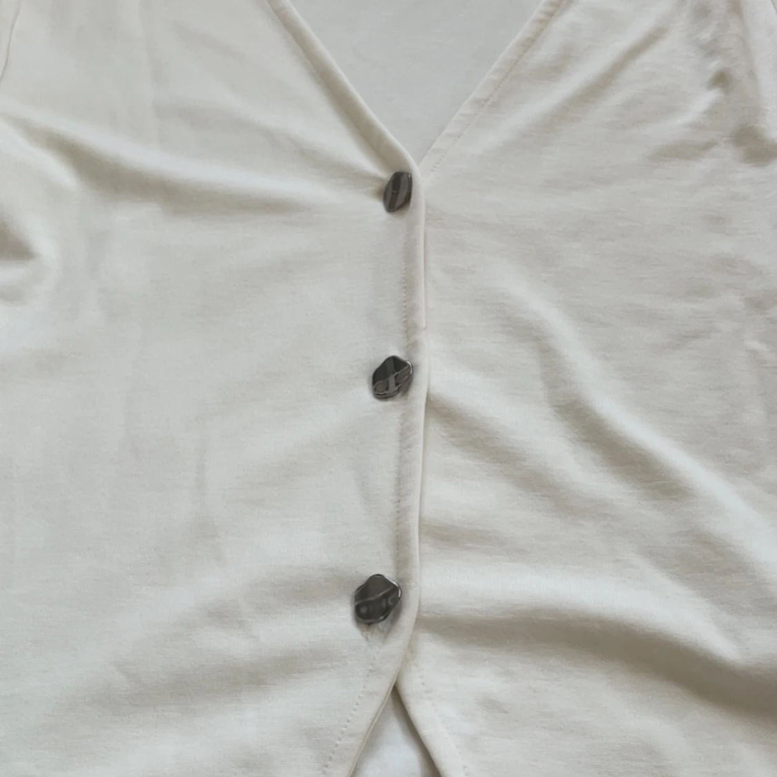 Snygg krämvit blus från 157 i storlek S. Den har en djup v-ringning och tre coola mörka knappar framtill. Materialet känns mjukt och lätt, perfekt för dig som gillar enkel och clean stil. Kortärmad och med en rak passform som är lätt att matcha.