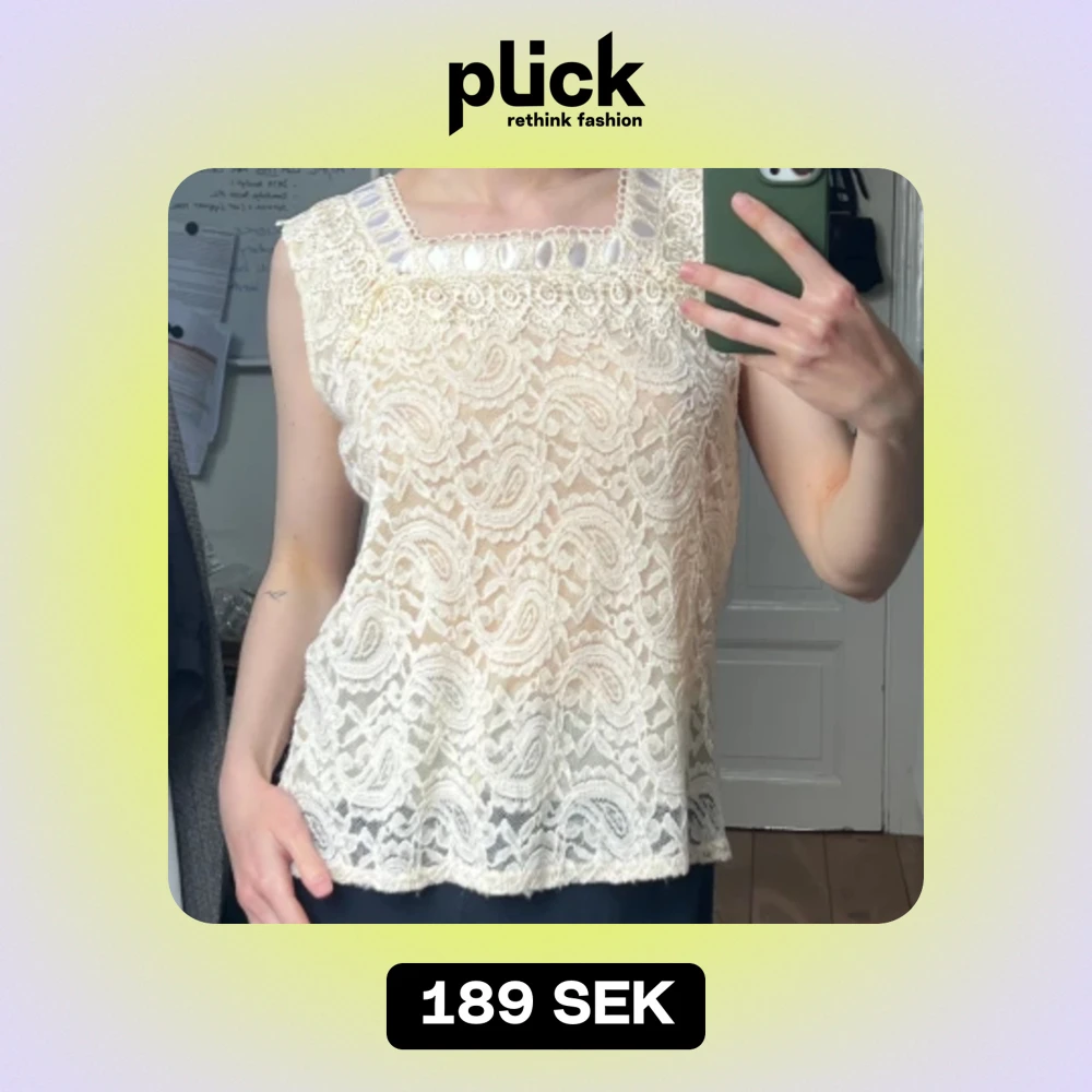 Så vackert krämvitt spetslinne i fint skick🌸 Genomskinligt i ryggen men finns ett ”insytt” underlinne i fram💕 Oversize på mig som vanligtvis bär XS, så uppskattar storleken till S/M