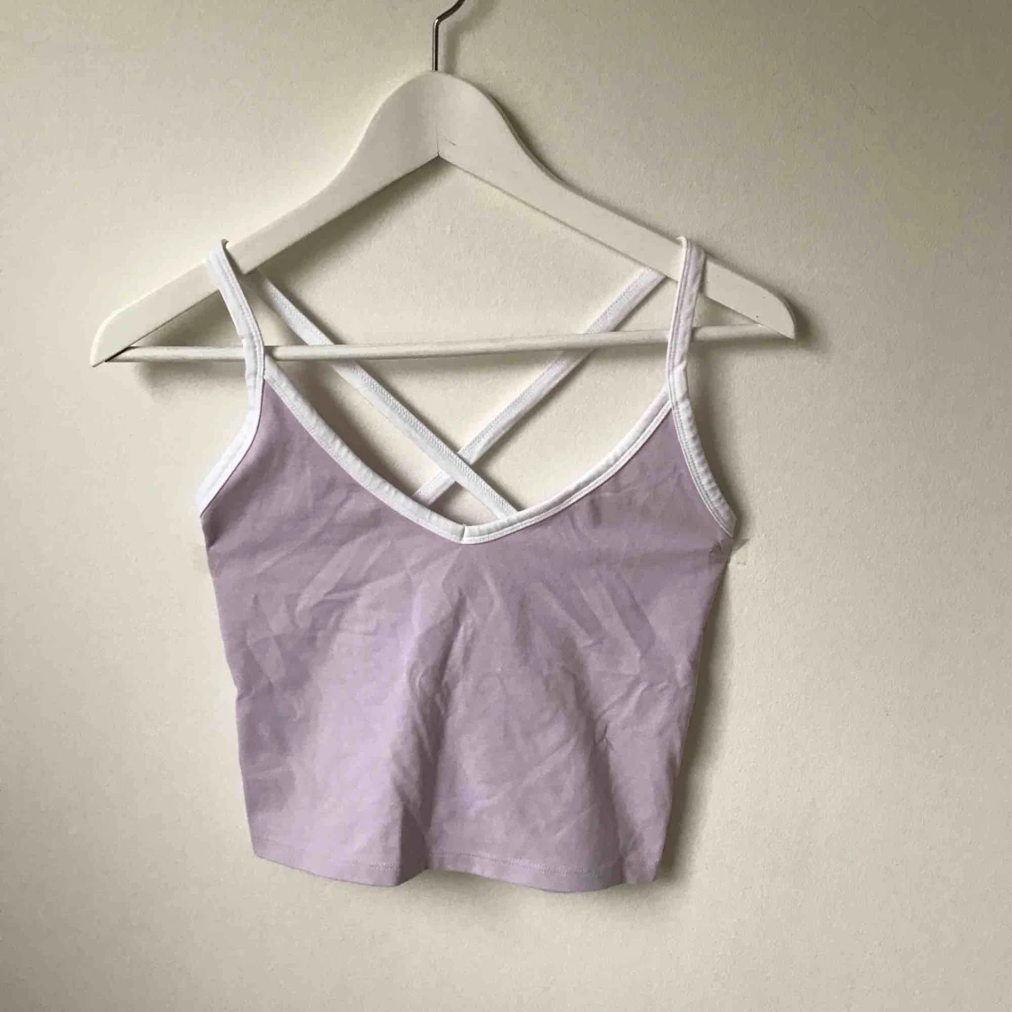 Ljuslila och vit kort topp med kryssrygg. Använd 1 gång. Köparen står för fraktkostnad enligt postens portotabell.