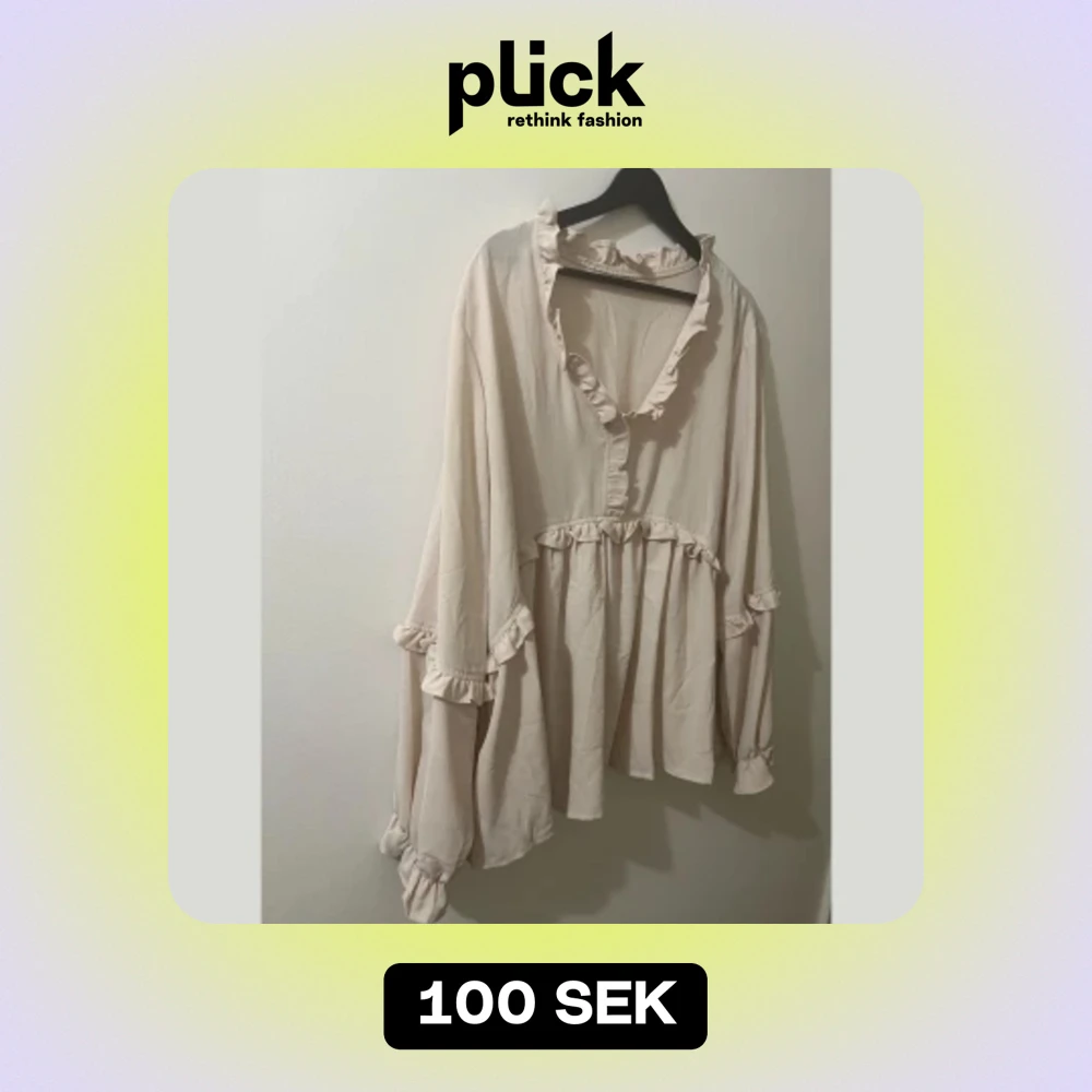 Säljer en superfin beige blus L-XL med volangdetaljer. Den har långa ärmar och en lös passform