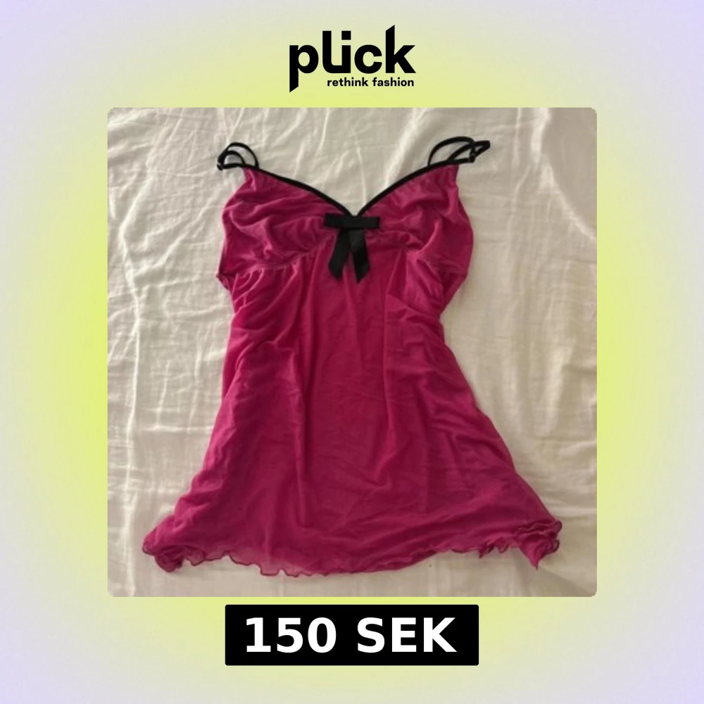 Jätte fint rosa linne med en svart rosett. Är genomskinligt i materialet! Är en L men har själv haft den som är XS och är väldigt söt även då🥰 Hade såklart passat en L i storleken såklart, men har själv använt en pin för att få den mer figurformad