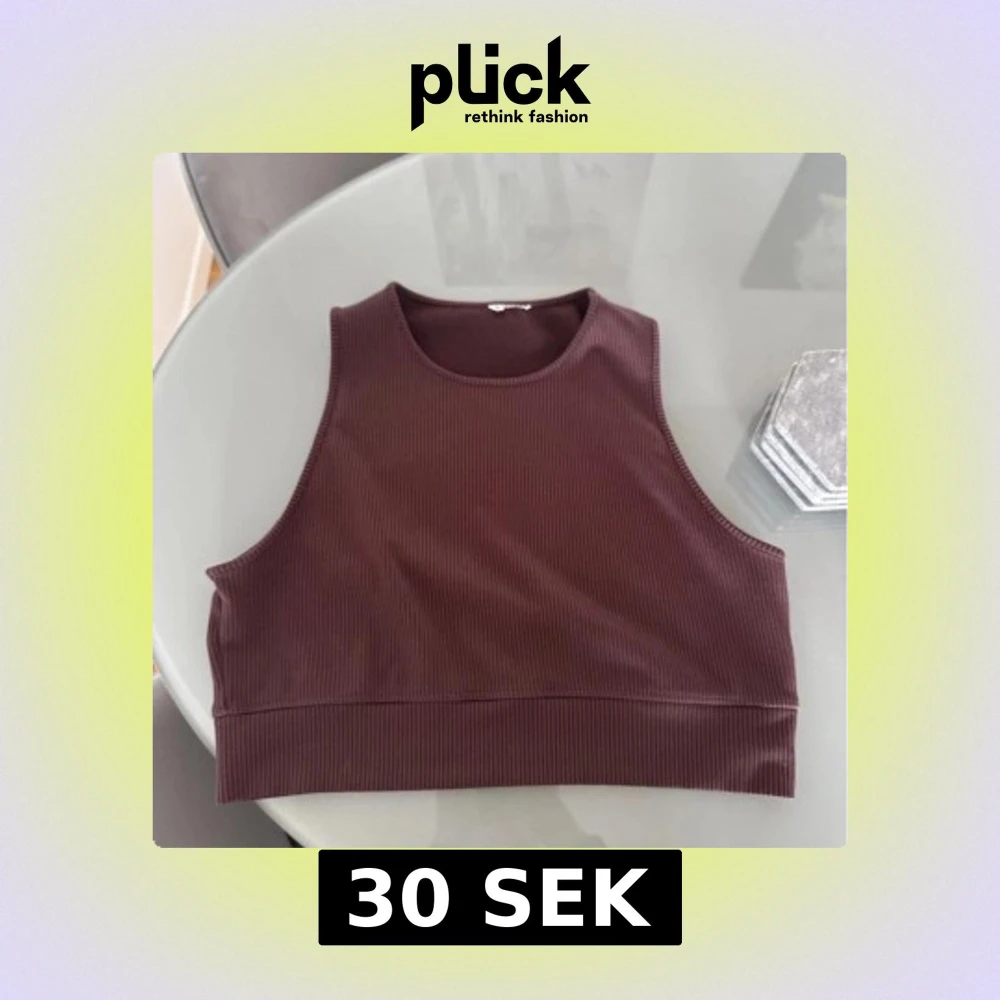 Säljer en croppad ribbad linnetopp i mörkbrun färg. Toppen är ärmlös med rund halsringning och har en tight passform. Perfekt att styla med höga jeans eller kjol för en trendig look.