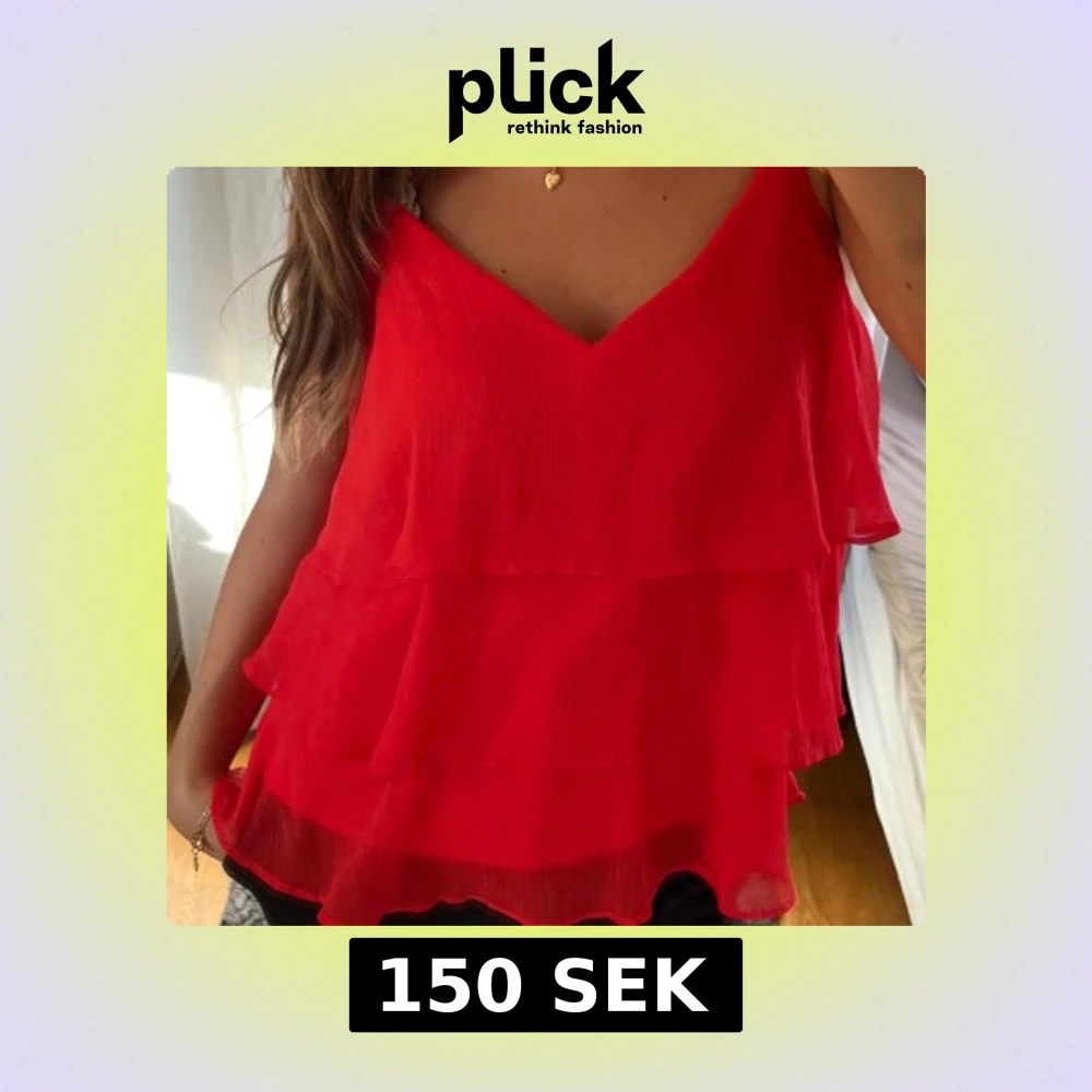 Säljer en röd linnetopp med flera lager volanger och smala axelband. Toppen har v-ringning och är tillverkad i ett lätt, luftigt material som ger en flowy känsla. Perfekt för dig som vill sticka ut med färg och volym. Lappen sitter kvar, aldrig använd!