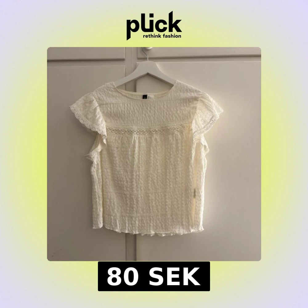 Supersöt vit blus från H&M i storlek L men skulle säga att det passar en M oxå. Blusen har korta volangärmar, spetsdetaljer över bröstet och en lätt skrynklig struktur i tyget🤗