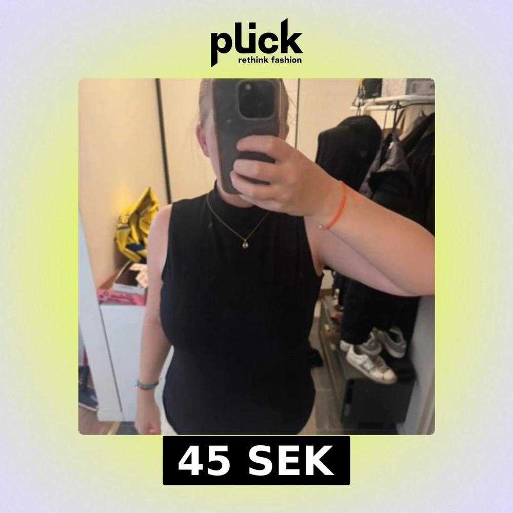 En stilren svart polotopp utan ärmar, med hög hals och rak passform. Toppen är enkel och clean, perfekt att matcha med jeans eller kjol. Materialet känns mjukt och stretchigt, vilket gör den bekväm att bära hela dagen.