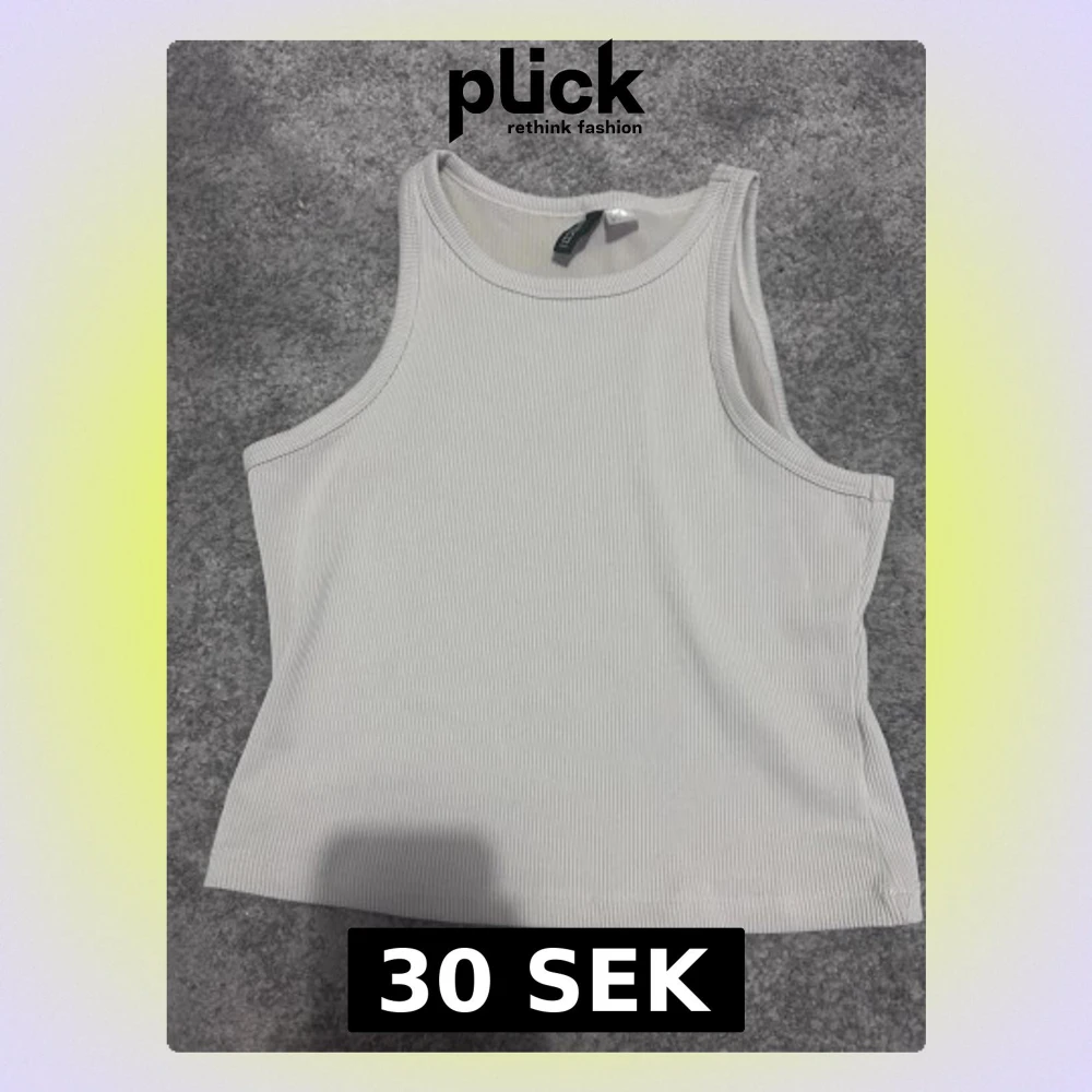 Snygg vit ribbad linnetopp från H&M Divided. Toppen är ärmlös med rund halsringning och har en tight passform. Perfekt att styla med jeans eller kjol för en fräsch look.