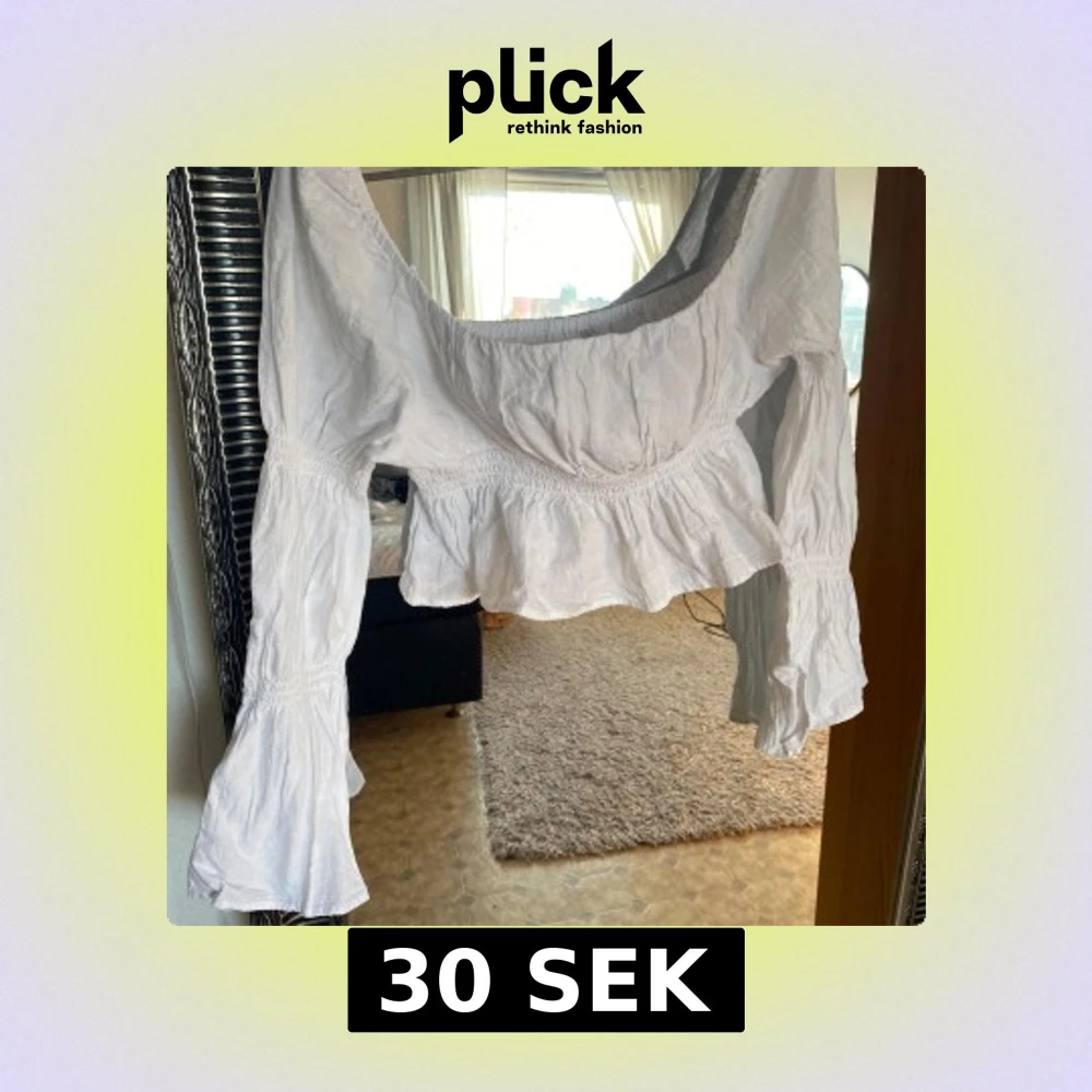 Säljer en söt vit blus med volangdetaljer och långa ärmar. Blusen har en elastisk midja och är perfekt för en bohemisk look. Den är tillverkad i ett lätt och luftigt material. Två små prick fläckar.