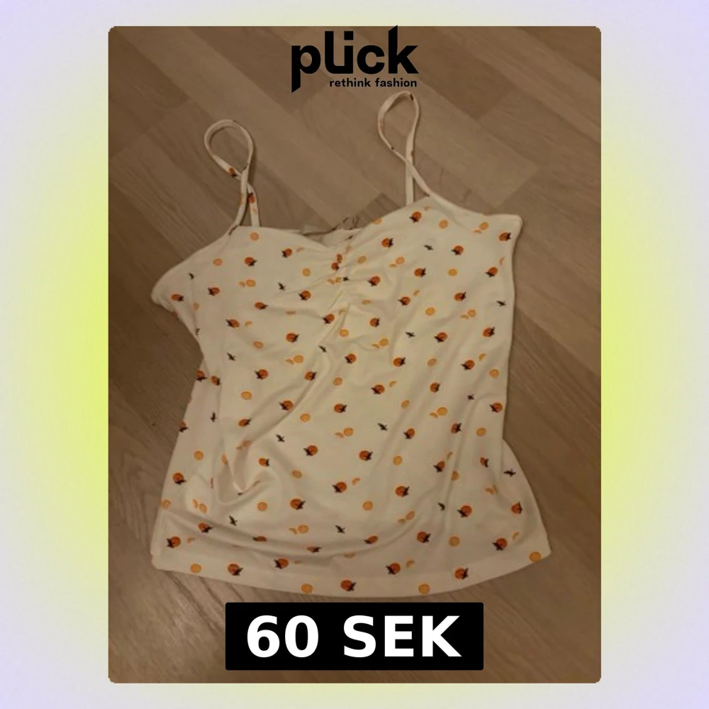 Supersöt vit linnetopp med tunna axelband och tryck av små apelsiner och apelsinskivor i orange. Toppen har lätt rynk framtill och är perfekt för varma dagar. Materialet känns mjukt och svalt mot huden. Oanvänd