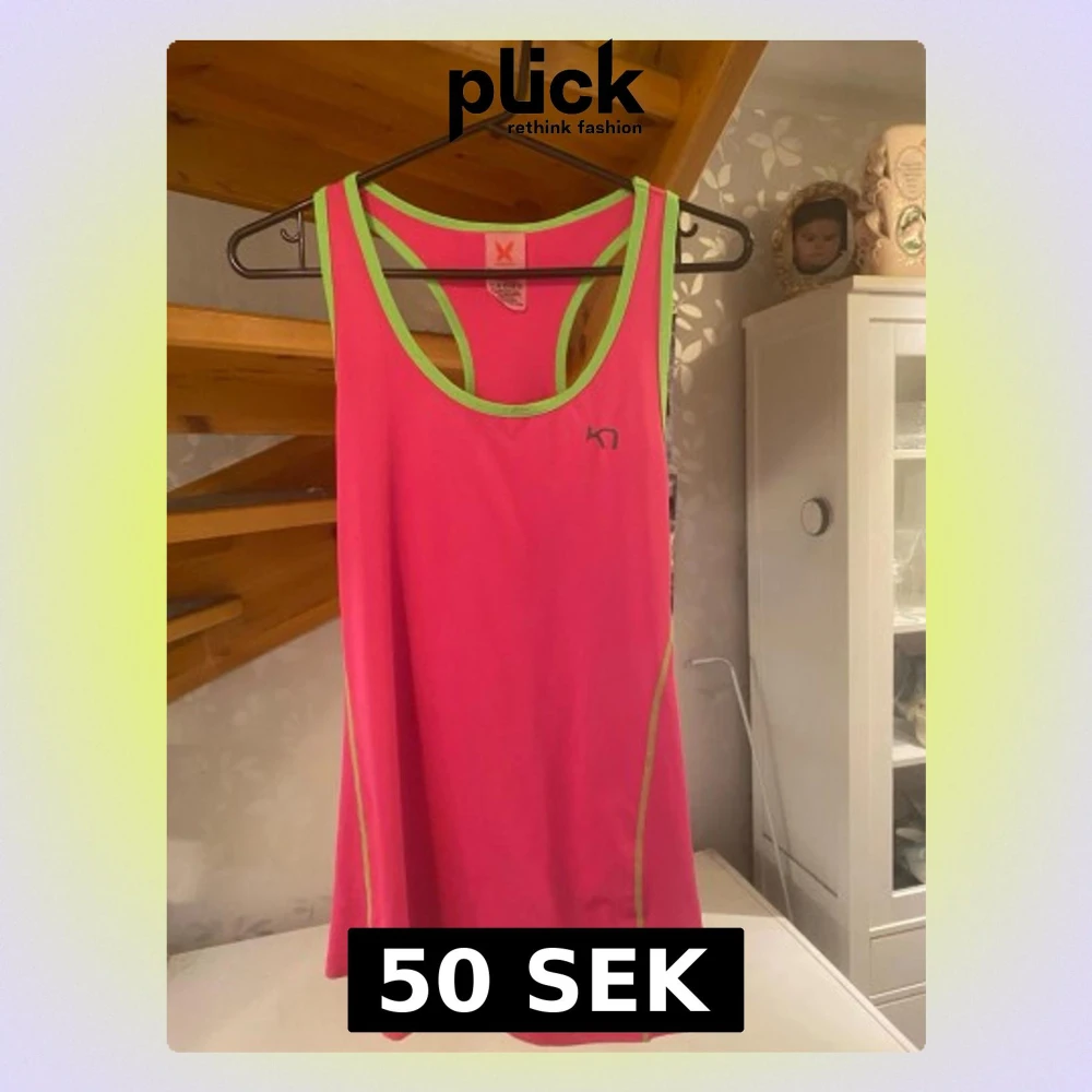 Säljer en sportig rosa linnetopp från Kari Traa med gröna detaljer och logga på bröstet. Toppen har brottarrygg och är tillverkad i ett mjukt, stretchigt material som passar perfekt för träning. Snygg kontrast mellan rosa och grönt för en fräsch look.
