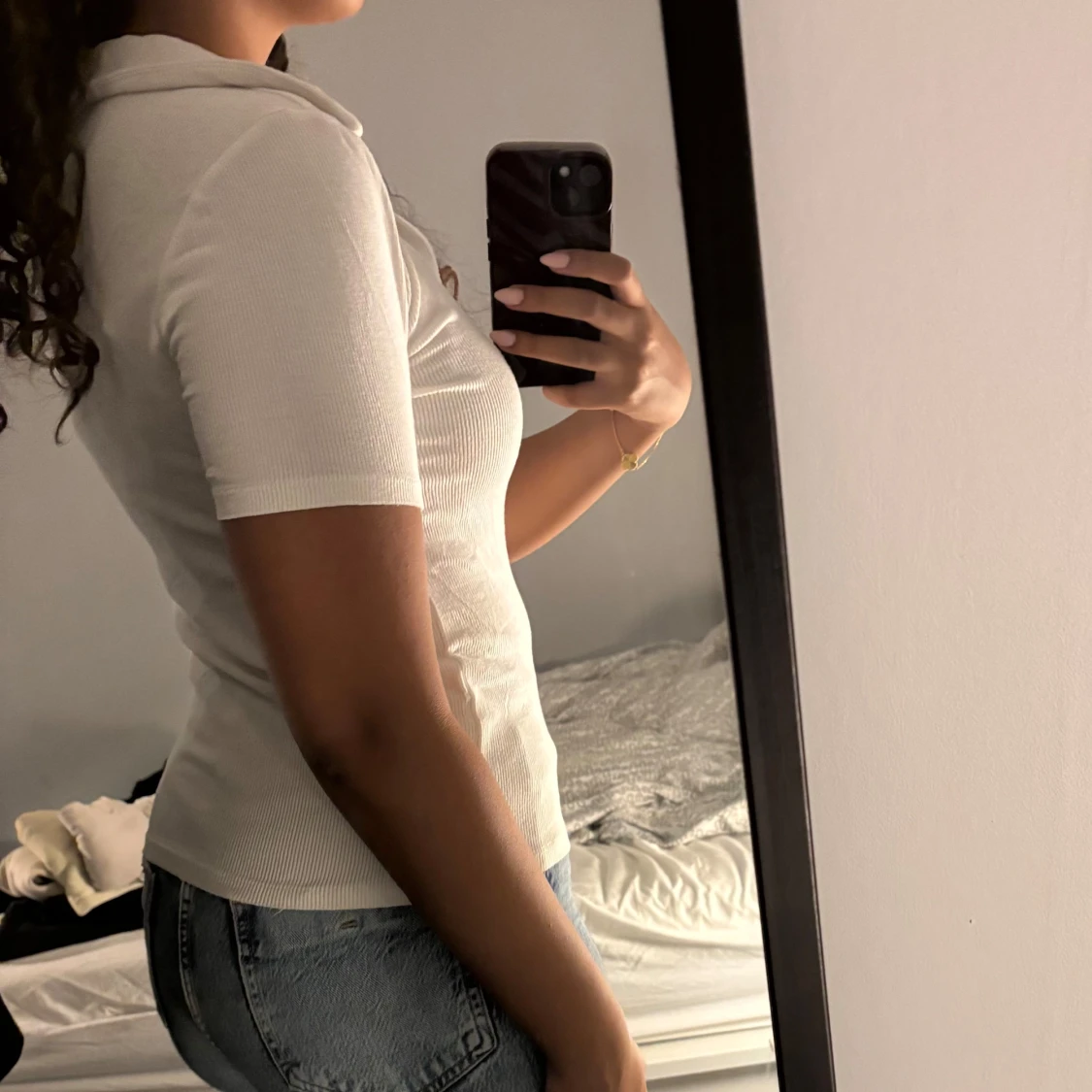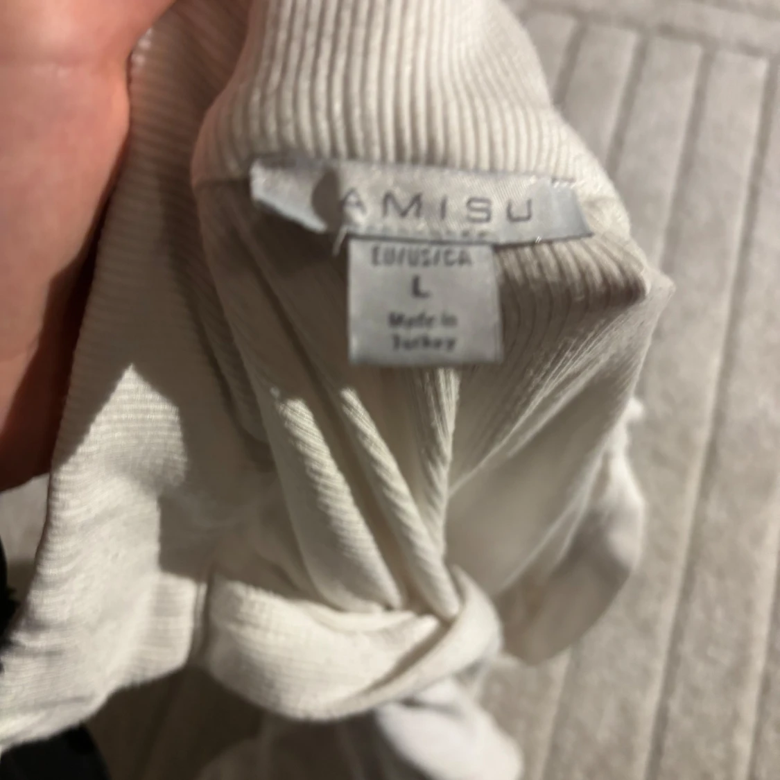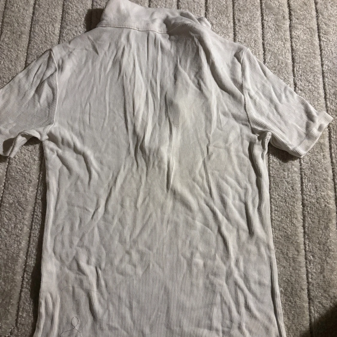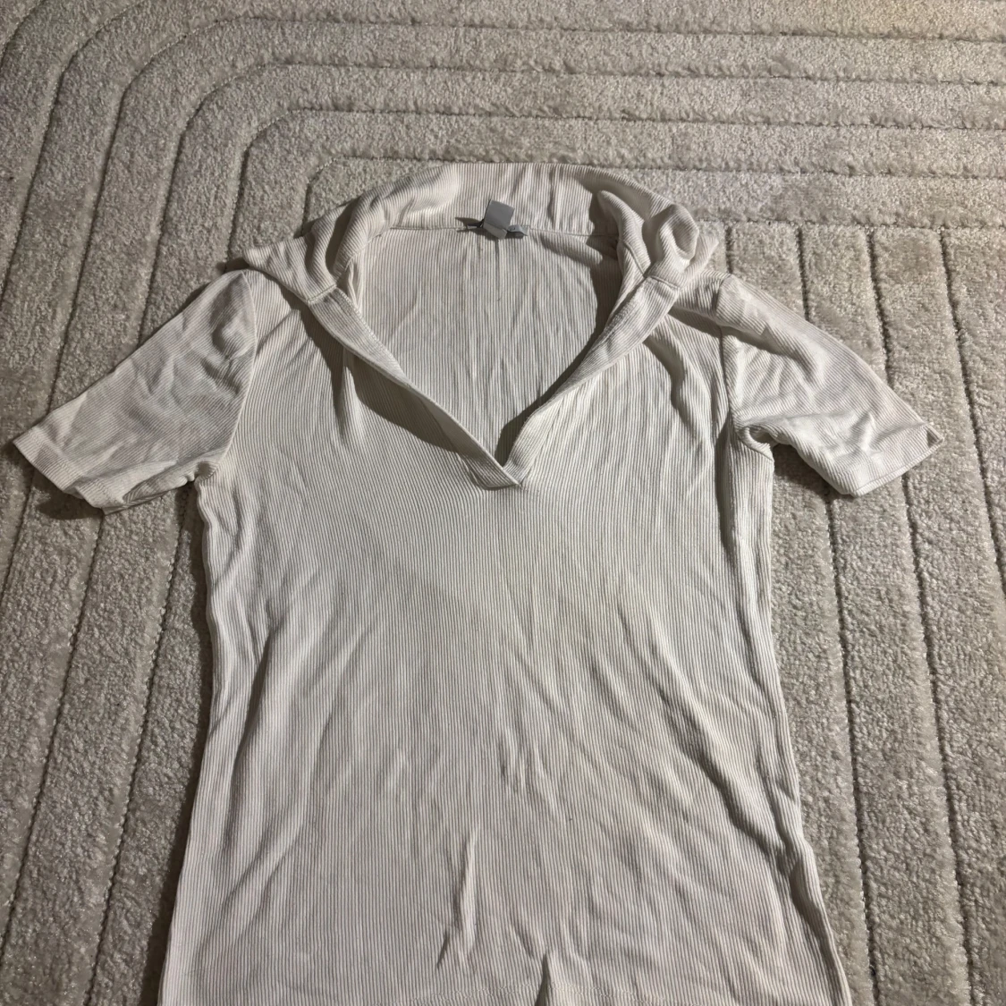 Säljer en vit ribbad topp från New Yorker i storlek L. Toppen har korta ärmar och en v-ringad krage som ger en stilren look. Perfekt för en avslappnad stil.