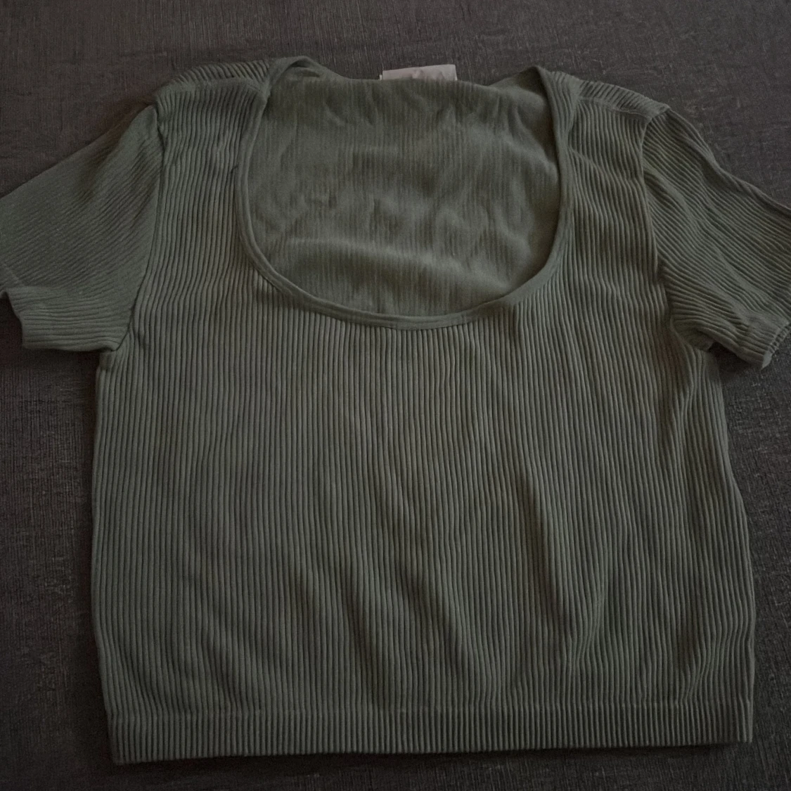 Säljer en stilren grön ribbad topp med korta ärmar och rund halsringning. Perfekt för en avslappnad look. Passar bra till jeans eller kjol.