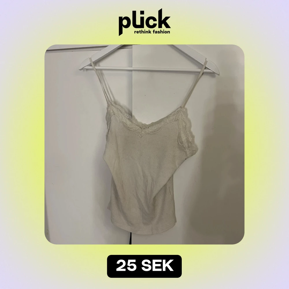 Säljer en söt vit grå ribbad linnetopp med tunna axelband och spetsdetaljer längs kanten.