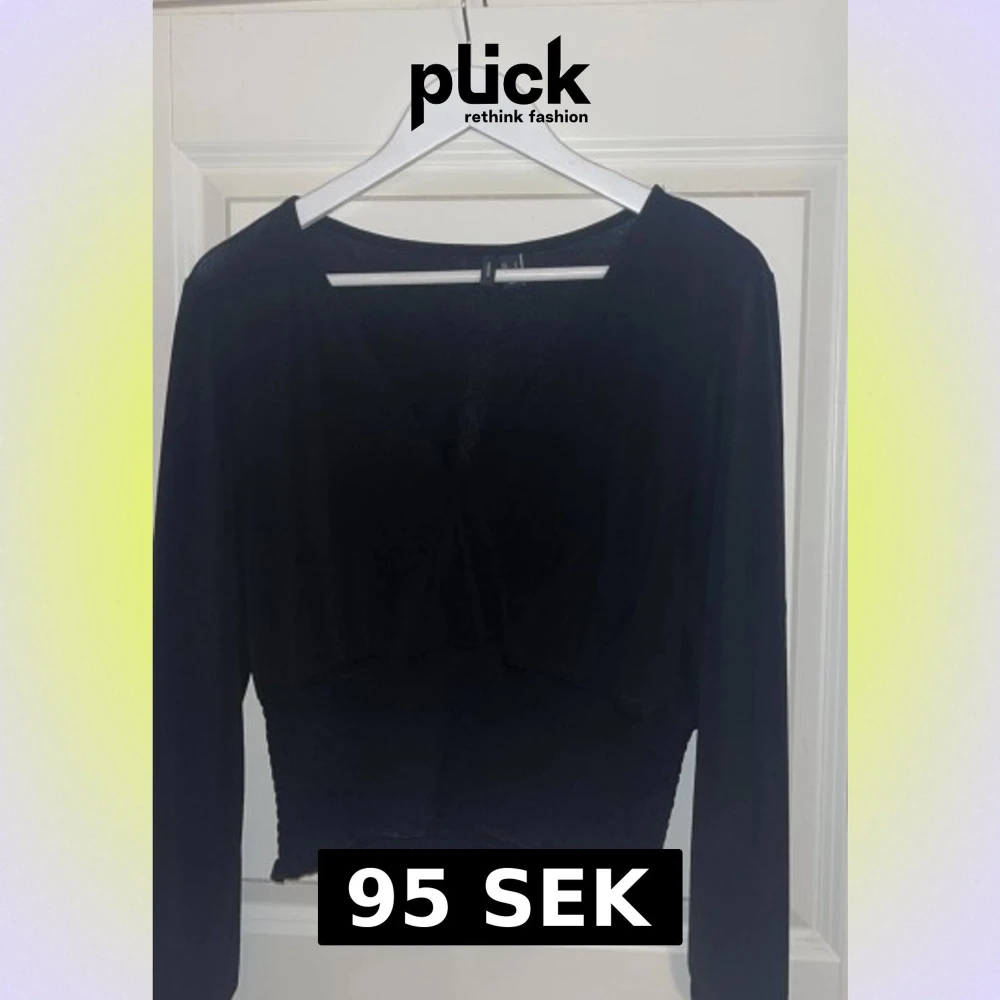 Säljer en svart croppad topp med lång ärm och v-ringad hals. Toppen har en ribbad och elastisk midja med vågig kant nedtill som ger en snygg detalj. Perfekt att styla med höga jeans eller kjol för en trendig look.