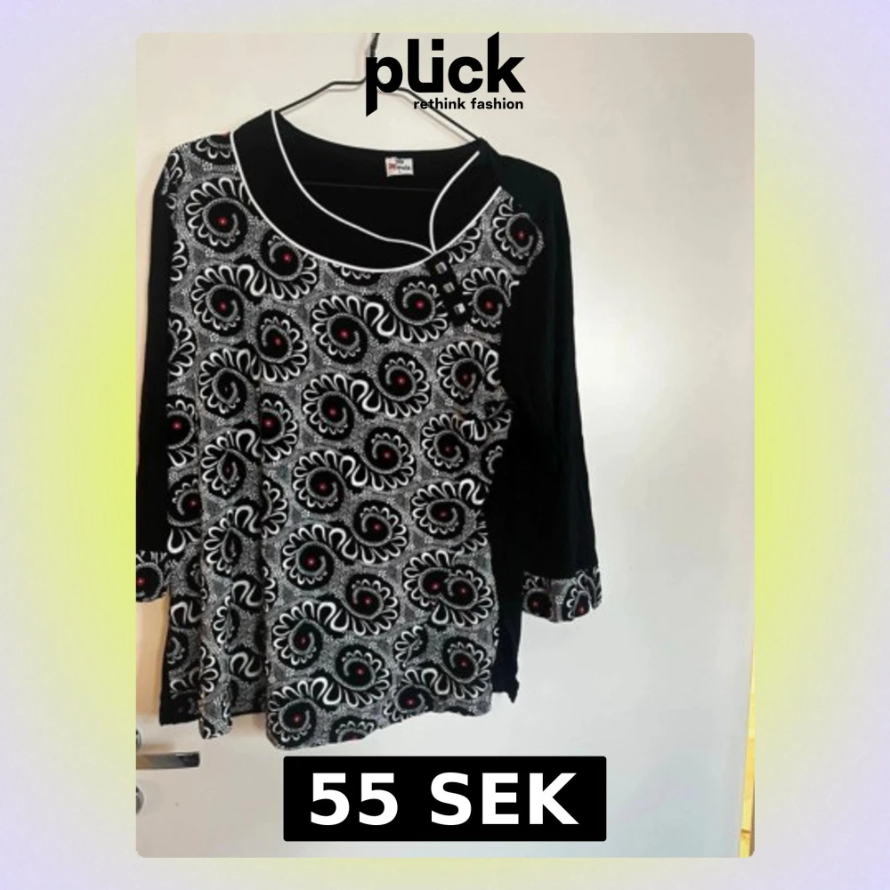 Unik blus från Mia Moda i svart och vitt med blommigt mönster och röda detaljer. Trekvartsärm med mönstrade muddar och lös passform. Perfekt för dig som gillar att sticka ut med coola mönster och kontraster. Rök och djurfritt hem. Pruta gärna !🌸