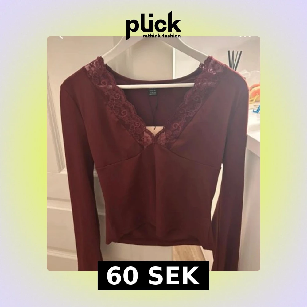 Säljer en vinröd långärmad topp från SHEIN BAE med v-ringning och spetsdetaljer längs halsen. Toppen har en figurnära passform och är tillverkad i ett mjukt, stretchigt material som känns skönt mot huden. Perfekt för dig som gillar romantiska detaljer och snygg stil.
