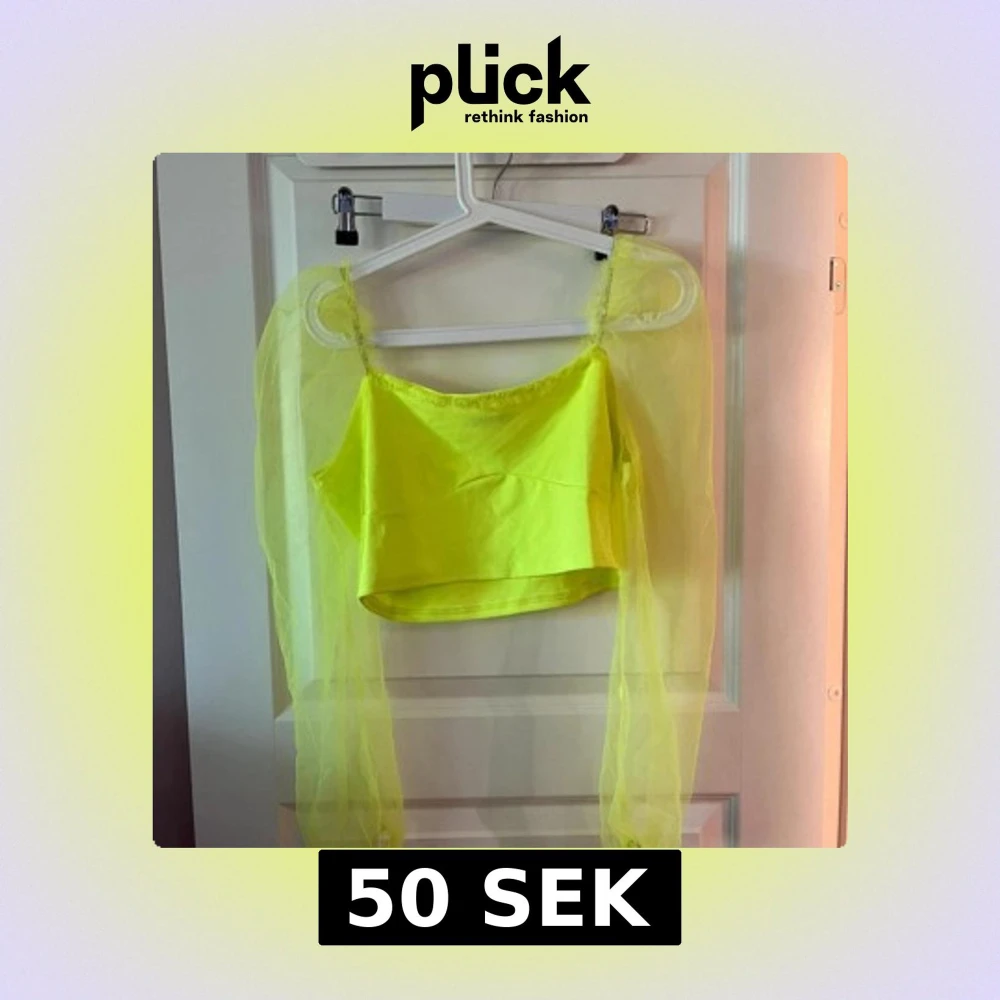 Supercool neongul croppad topp med långa transparenta meshärmar. Toppen har en rak halsringning och är perfekt för dig som vill sticka ut. Materialet är mjukt och stretchigt med tunna ärmar som ger en edgy vibe.