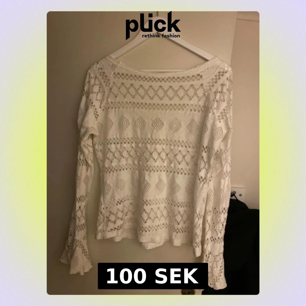 Säljer en vit långärmad blus från B.Young med v-ringning med spetsmönster. Blusen har utsvängda ärmslut och ett snyggt geometriskt mönster i tyget. Storlek L men passar mer som M