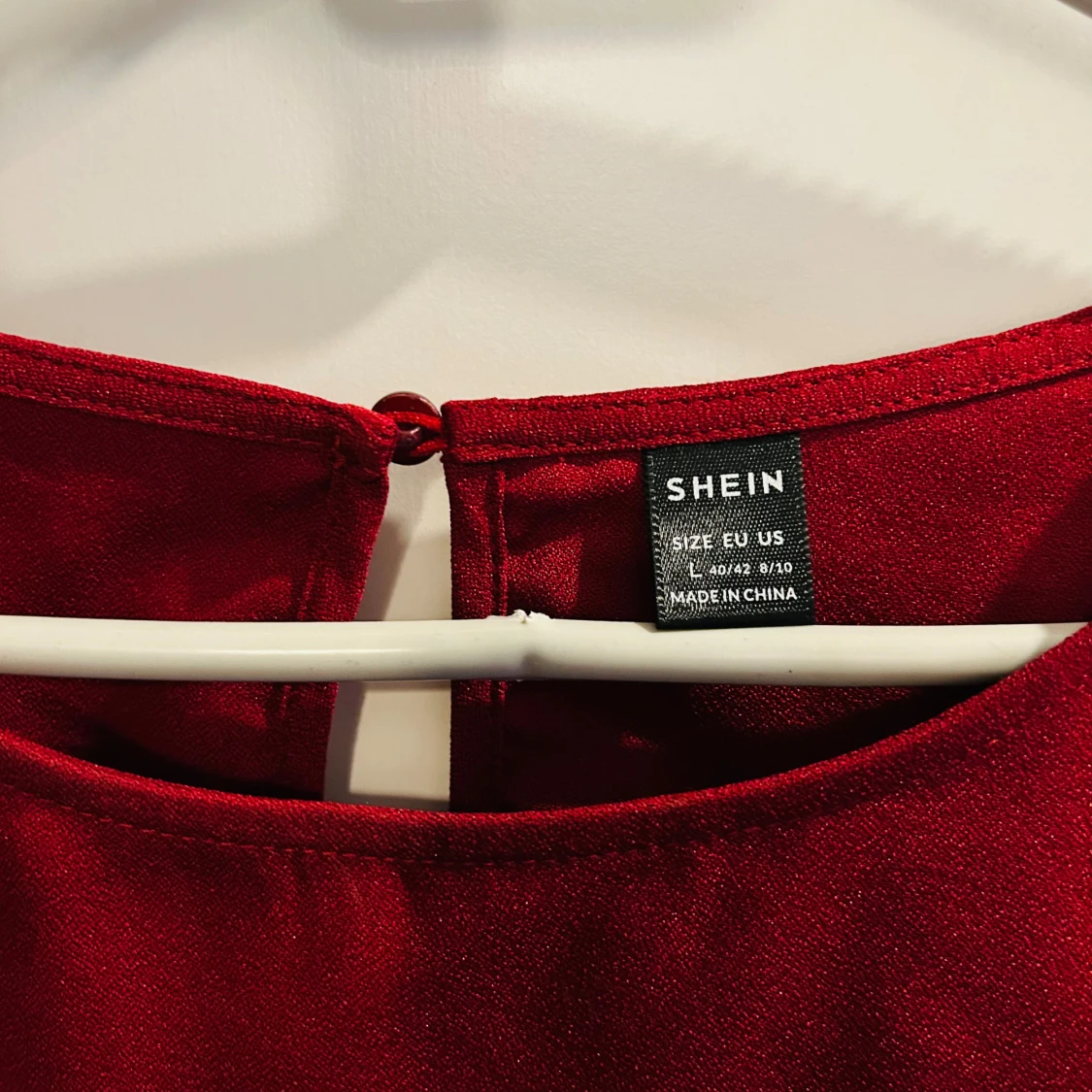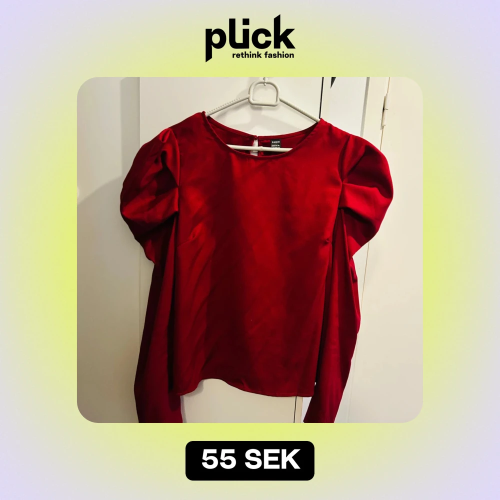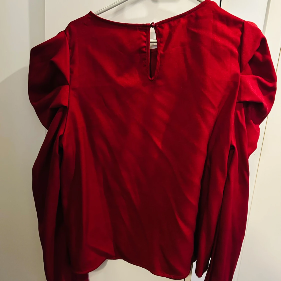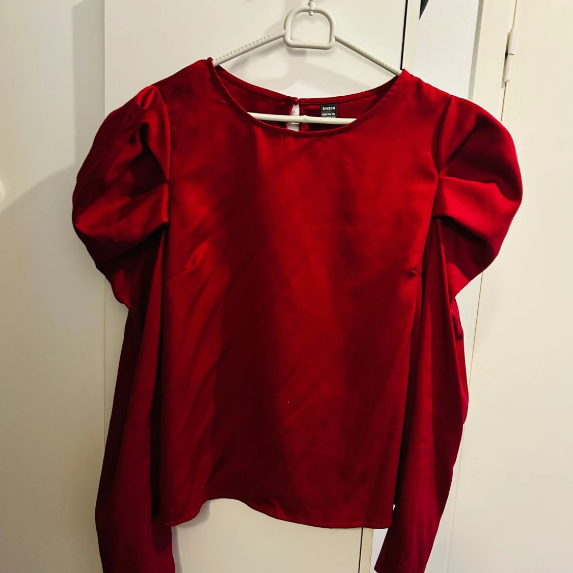 Snygg röd topp från Shein i ett glansigt material. Den har långa ärmar med puffiga axlar som ger en trendig look. Perfekt för festliga tillfällen eller en utekväll. Toppen är i mycket bra skick och redo att bäras av någon som vill sticka ut!