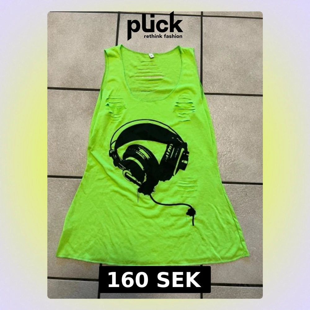 Cool neongrön linnetopp med svart tryck av stora hörlurar på framsidan. Toppen har flera slitna detaljer framtill och är ärmlös med rund halsringning. Perfekt för dig som gillar streetstyle och vill sticka ut.