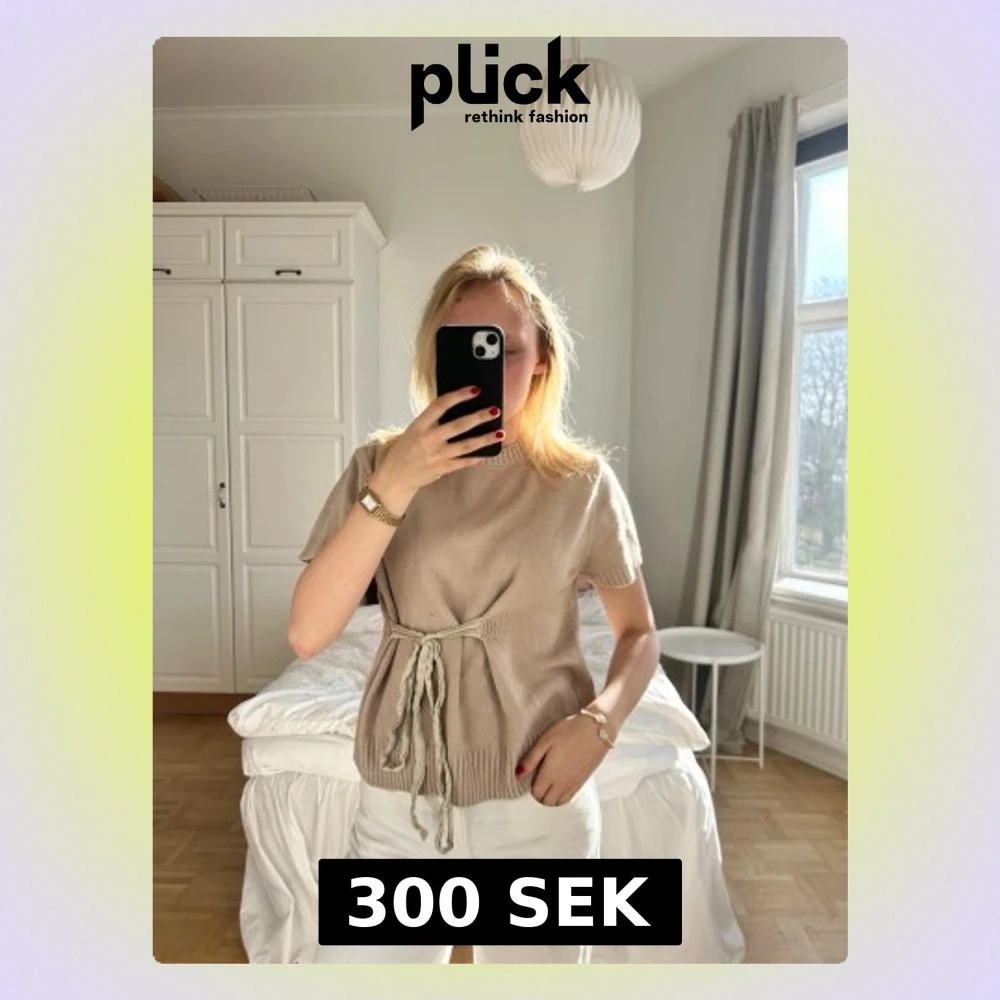 Säljer en beige stickad topp med korta ärmar och rund hals. Toppen har ett snyggt knytband i midjan som ger en fin siluett. Perfekt att styla med jeans eller kjol för en trendig look.