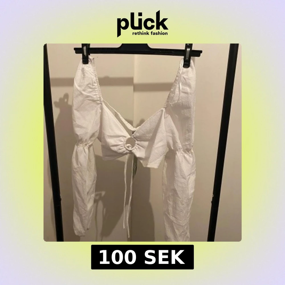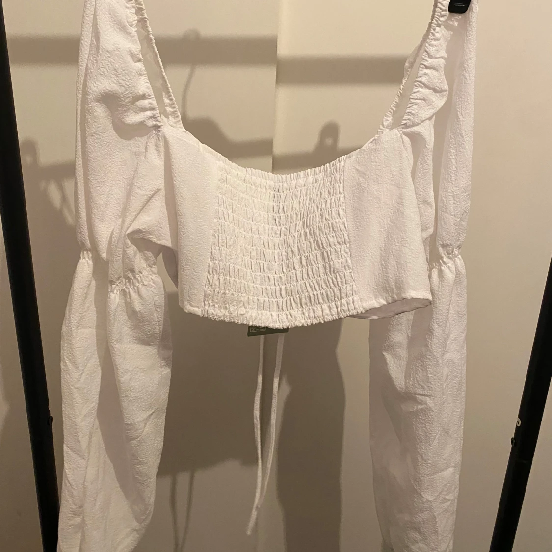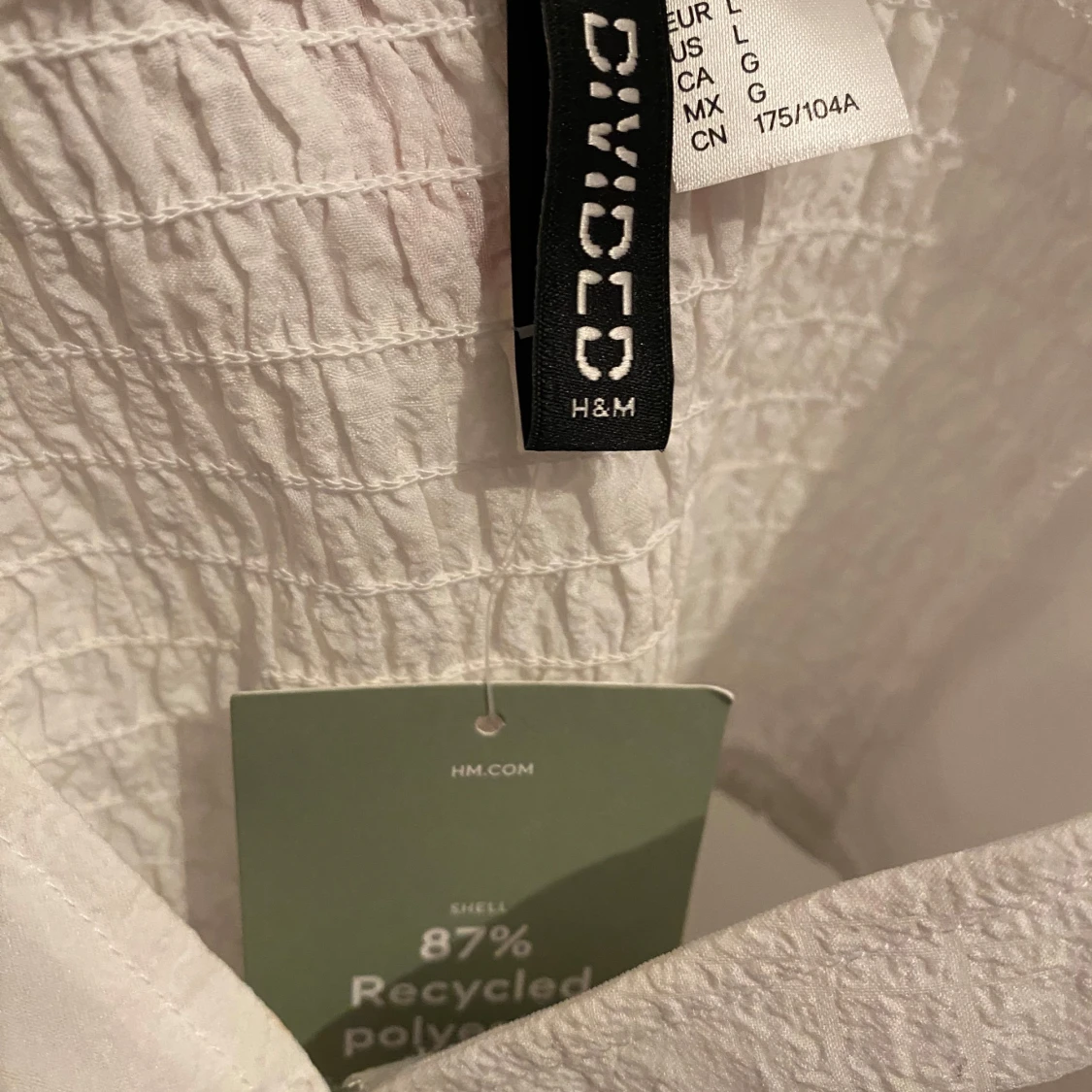 Trendig vit omlottopp från H&M Divided med långa puffärmar och snygg ringdetalj framtill. Toppen har knytning och smockad rygg för extra komfort. Tillverkad av 87% återvunnen polyester, perfekt för dig som gillar en cool och modern stil.