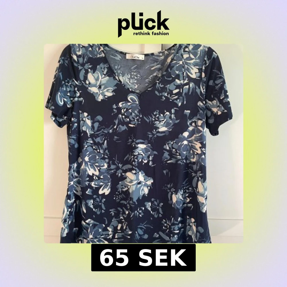 Snygg topp från ChaCha med blommigt mönster i olika blå nyanser och vitt. Modellen har v-ringning och korta ärmar. Materialet känns mjukt och följsamt, perfekt för dig som gillar en avslappnad men ändå stilren look.