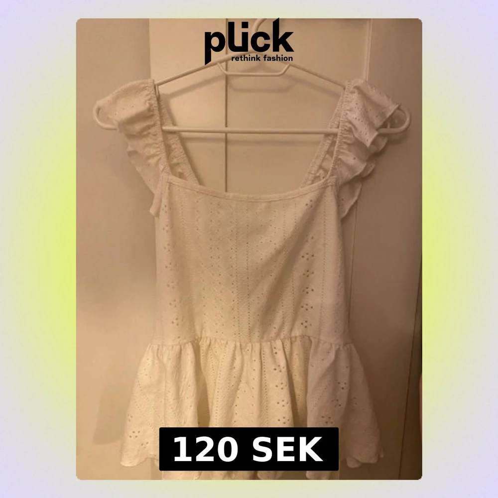 Supersöt vit blus med volangdetaljer på axlarna och knytning i ryggen. Blusen har broderade hålmönster och en luftig, flowy passform. Perfekt för varma dagar och ger en romantisk vibe till din outfit.