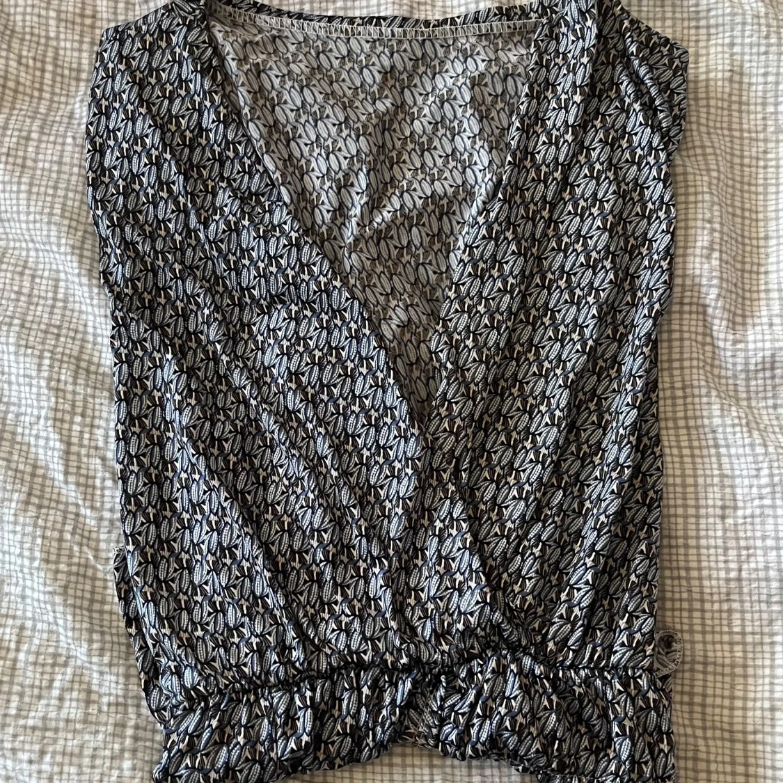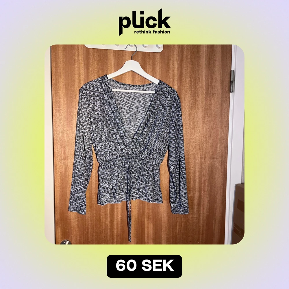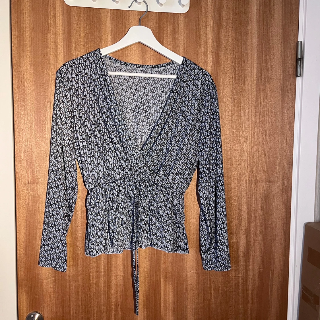 Snygg mönstrad omlottopp med långa ärmar och knytband i midjan. Perfekt för både vardag och fest. Den har en v-ringad design och ett stilrent mönster i svart och vitt.