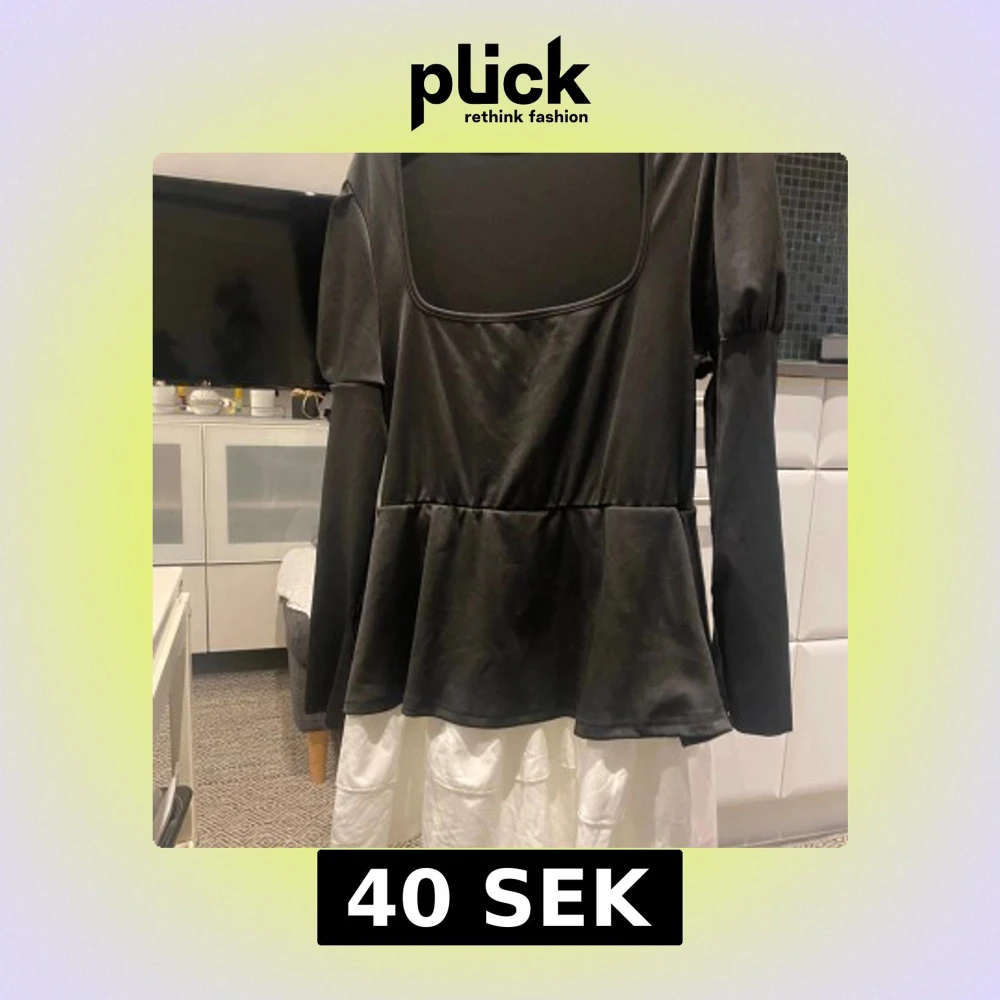 Säljer en svart långärmad topp med fyrkantig ringning och peplumvolang nedtill. Toppen har lätt puffade axlar och är i ett mjukt, stretchigt material som känns skönt mot huden. Perfekt för dig som gillar en stilren men ändå trendig look.