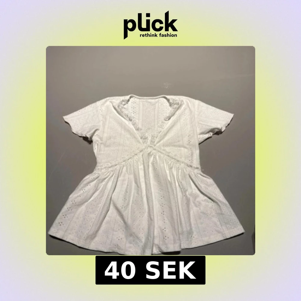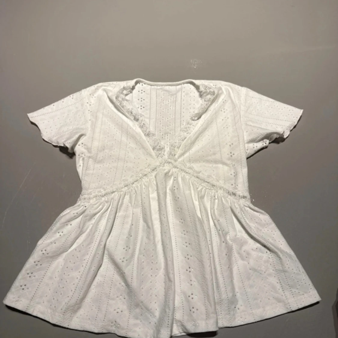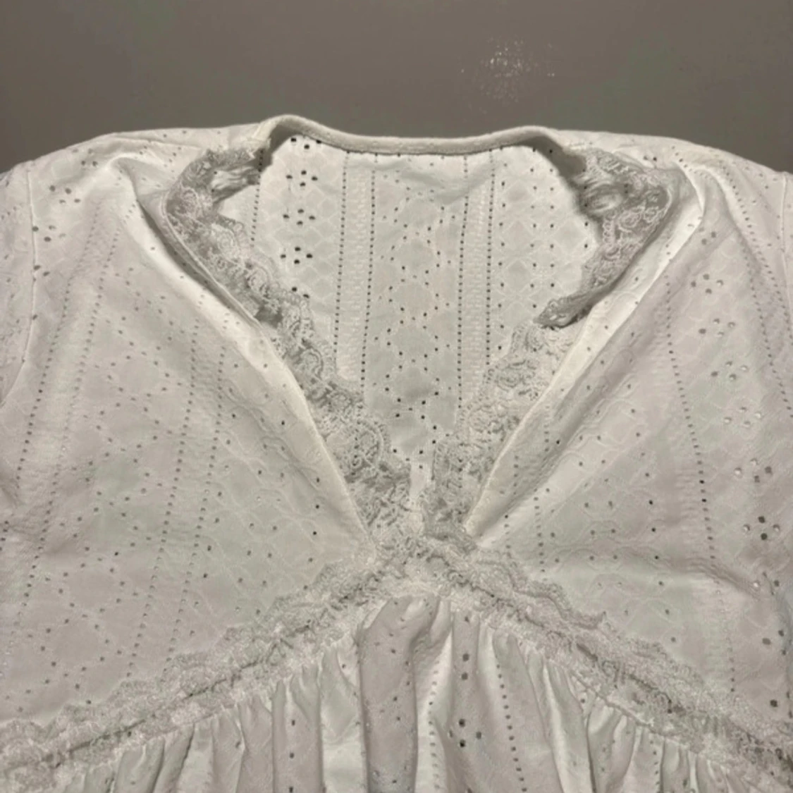 Superfin vit blus från SHEIN med v-ringning och spetsdetaljer längs halsringningen. Blusen har korta ärmar, broderade hålmönster och en lätt utsvängd passform. Perfekt för en fräsch och söt look under varmare dagar.
