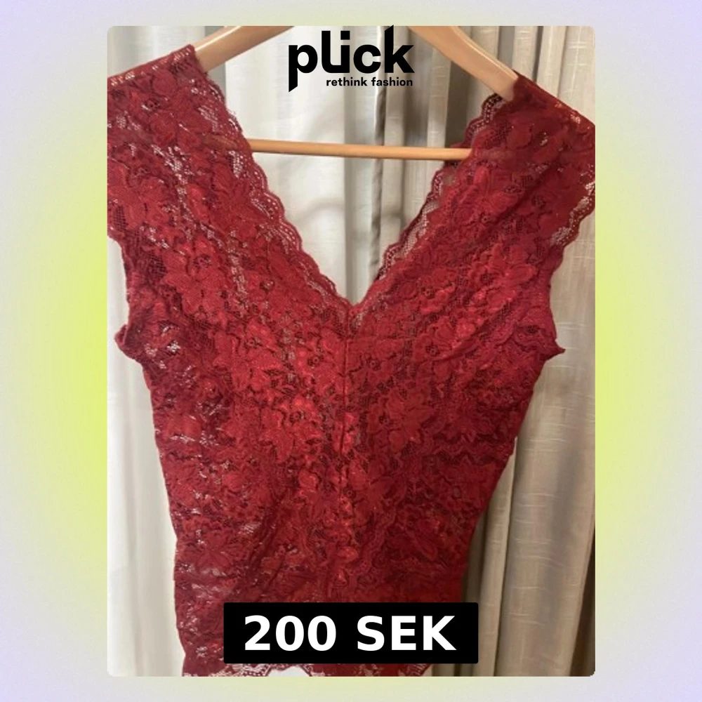 Säljer en vinröd blus i spets med v-ringad hals och ärmlös design. Blusen har ett detaljerat blommigt spetsmönster och är lätt transparent. Helt oanvänd eftersom det inte är min stil.