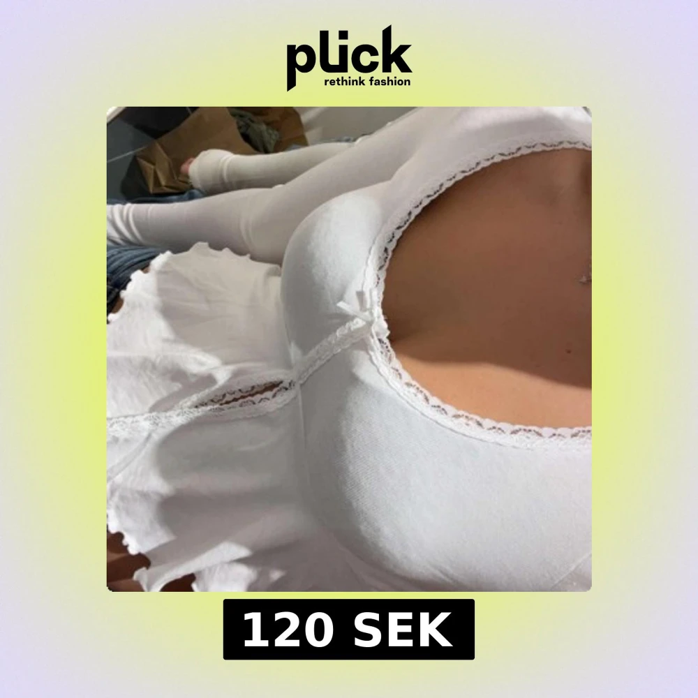 Supersöt vit långärmad topp med croppad passform och volangig nederkant. Urringning med spetskant och liten rosett framtill. Toppens material är mjukt och stretchigt, perfekt för en trendig look. Från Gina Tricot, säljer då jag aldrig använder den. 🌸