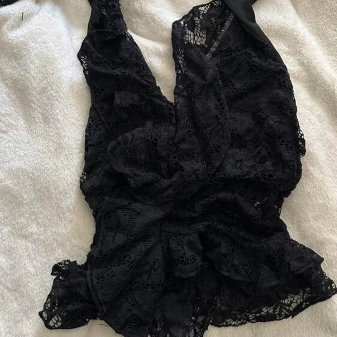 Säljer en svart omlottopp i spets med djup v-ringning och volangdetaljer. Toppen är ärmlös och croppad, storlek XS