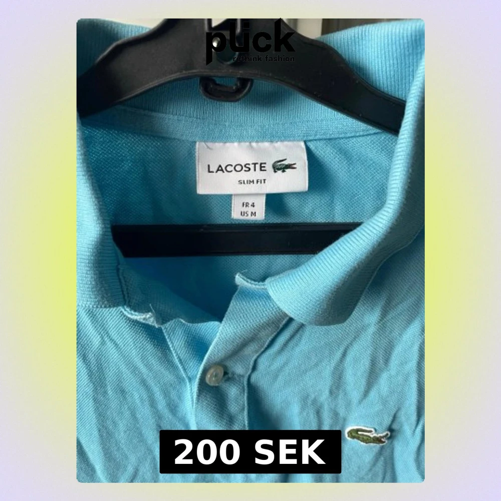 Säljer en ljusblå piké t-shirt från Lacoste i slim fit-modell. Klassisk krage, korta ärmar och två knappar framtill.