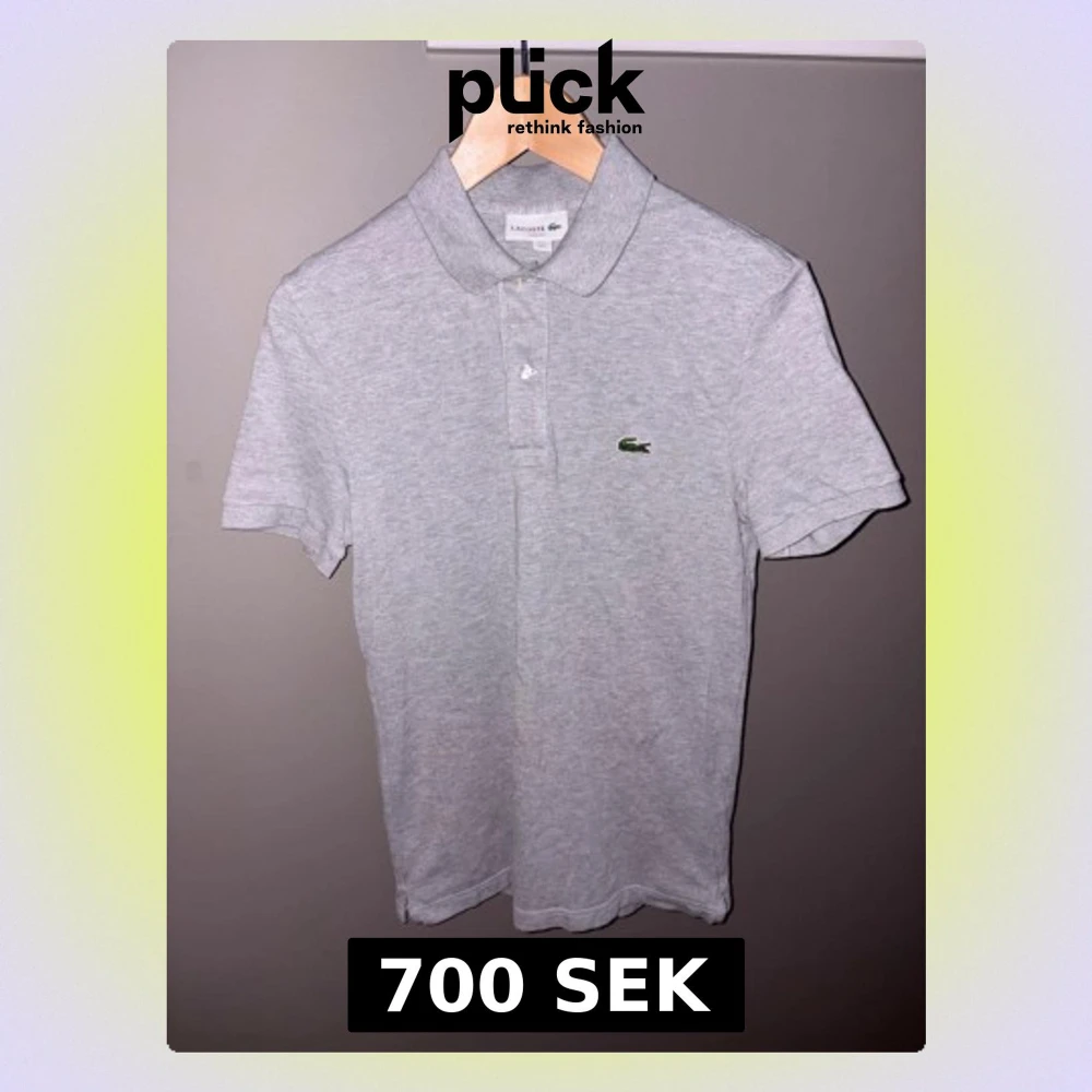 Säljer en klassisk ljusgrå pikétröja från Lacoste med korta ärmar och den ikoniska gröna krokodilloggan broderad på bröstet. Tröjan har krage och knappar framtill. Perfekt till en avslappnad men ändå stilren look.