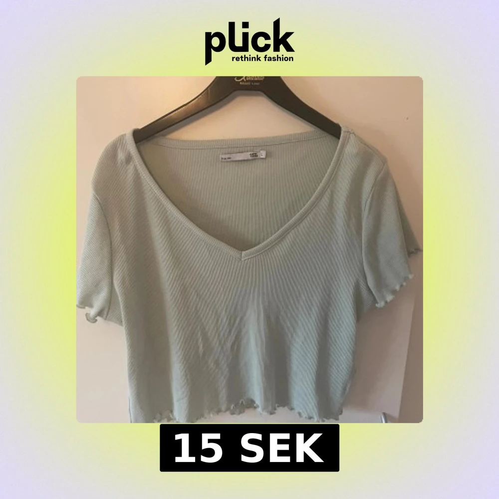 Säljer en ljusgrön croppad topp från 157 med v-ringning och korta ärmar. Toppen är ribbad och har vågiga kanter vid ärmslut och nederkant för en extra söt touch. Perfekt för dig som gillar en enkel men trendig stil.