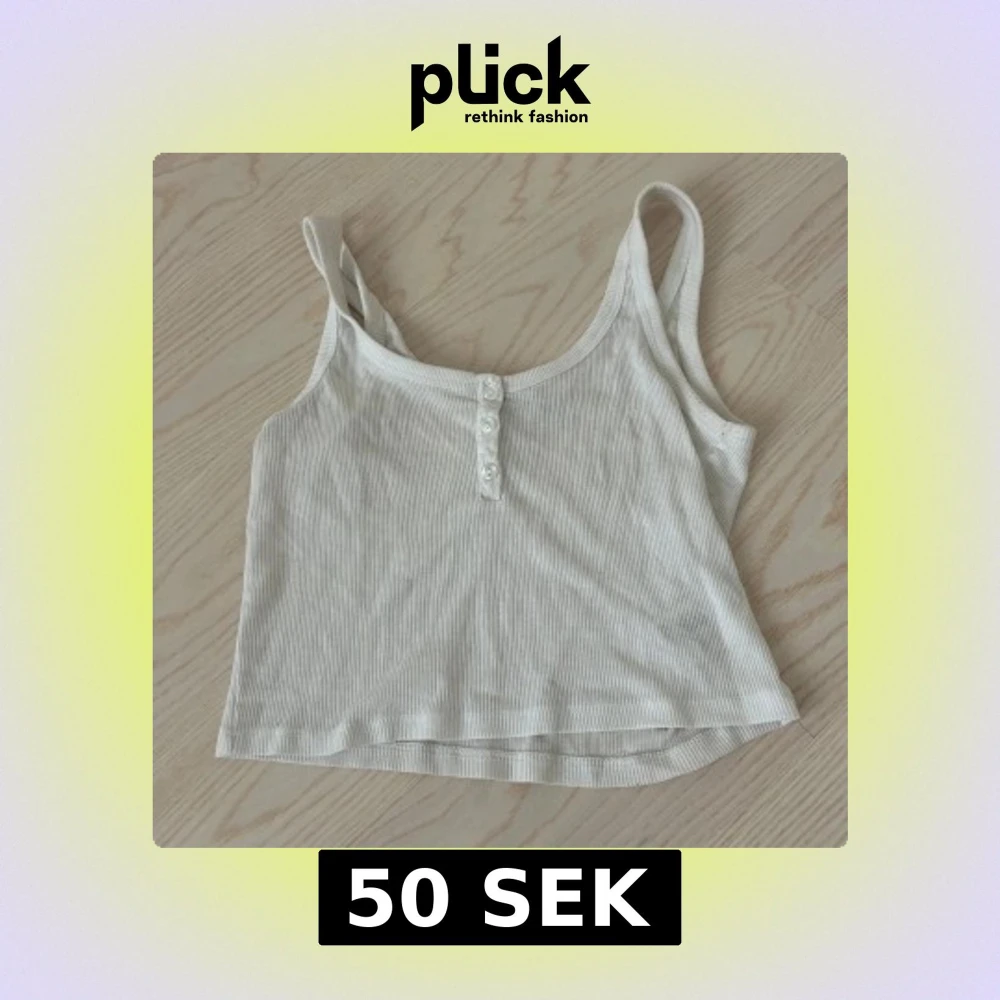 Säljer en fräsch vit ribbad linnetopp med croppad passform och smala axelband. Toppen har tre dekorativa knappar framtill och är tillverkad i mjuk bomull. Perfekt för varma dagar och enkel att matcha med jeans eller shorts.