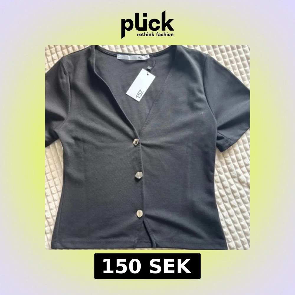 Svart blus med korta ärmar och snygg v-ringning från lager 157. Toppen har tre silvriga knappar framtill och är figurnära i modellen. Perfekt att styla med jeans eller kjol för en clean look. Pris går att diskutera.