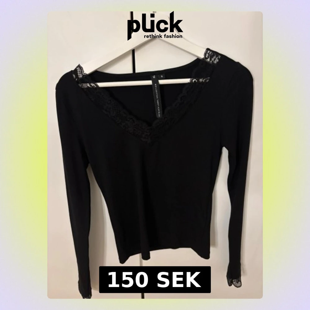 Svart långärmad topp från The Black Label Collection med v-ringning och dekorativ spetskant runt halsen. Tunn och stretchig modell som sitter snyggt på kroppen. Perfekt att styla med jeans eller kjol.