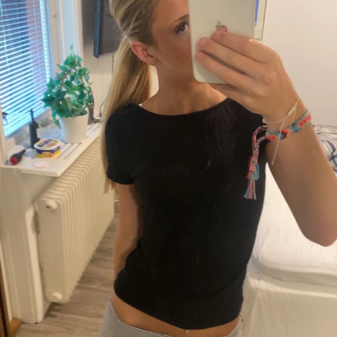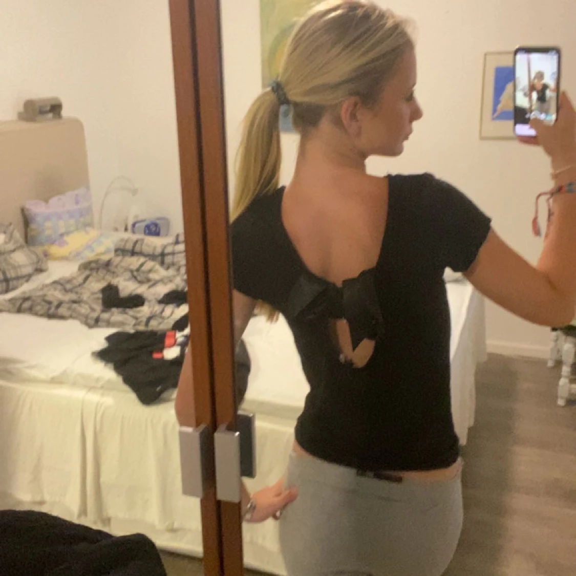 Säljer denna svarta kortärmade topp från 157 med en snygg öppen rygg och stor rosett i satin baktill eftersom den aldrig kommer till användning och är lite förstor för mig!