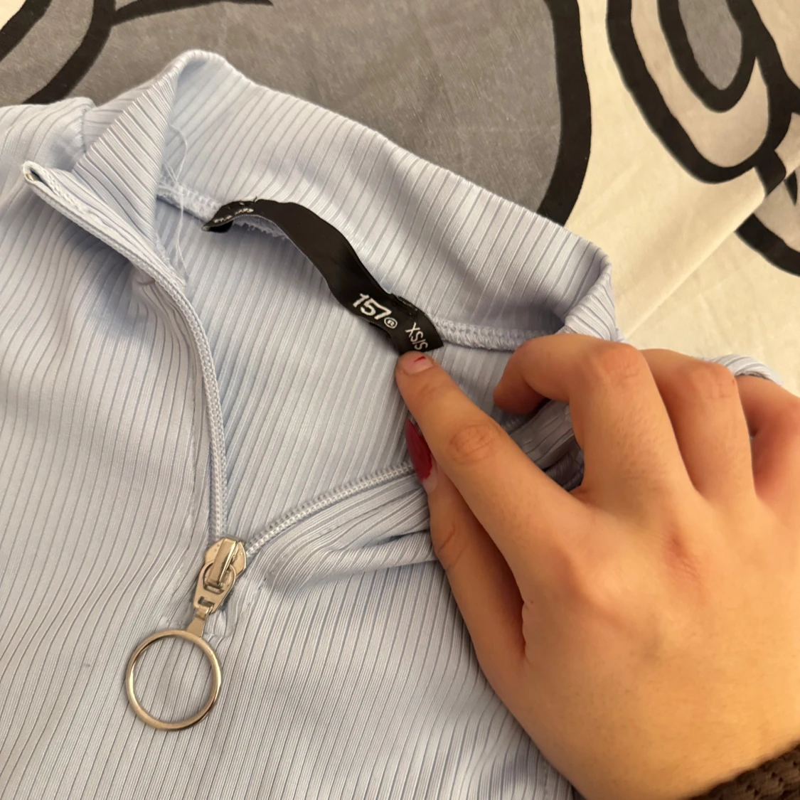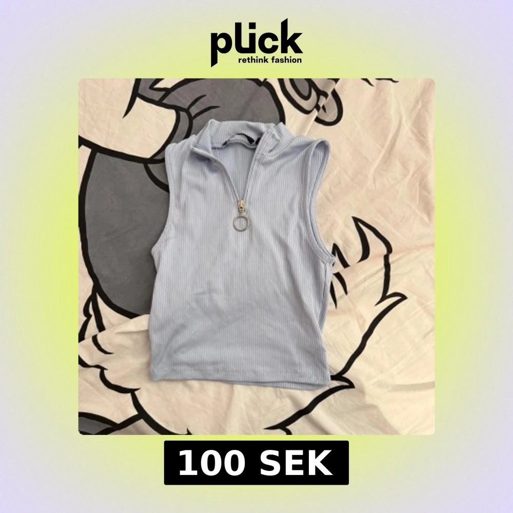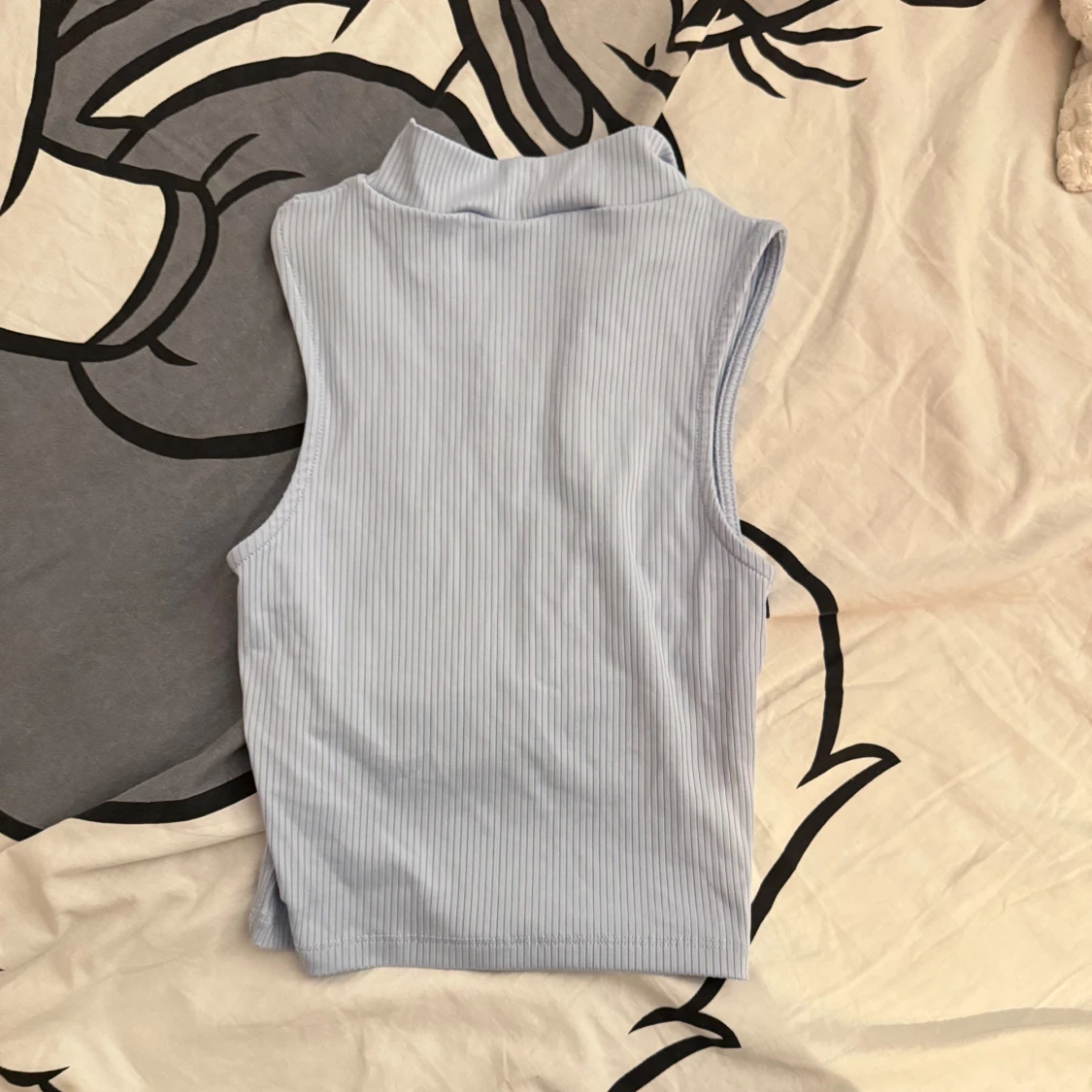 Snygg ljusblå ärmlös topp med dragkedja framtill och en liten ringdetalj. I storlek XS/S från lager 157.