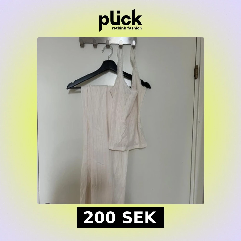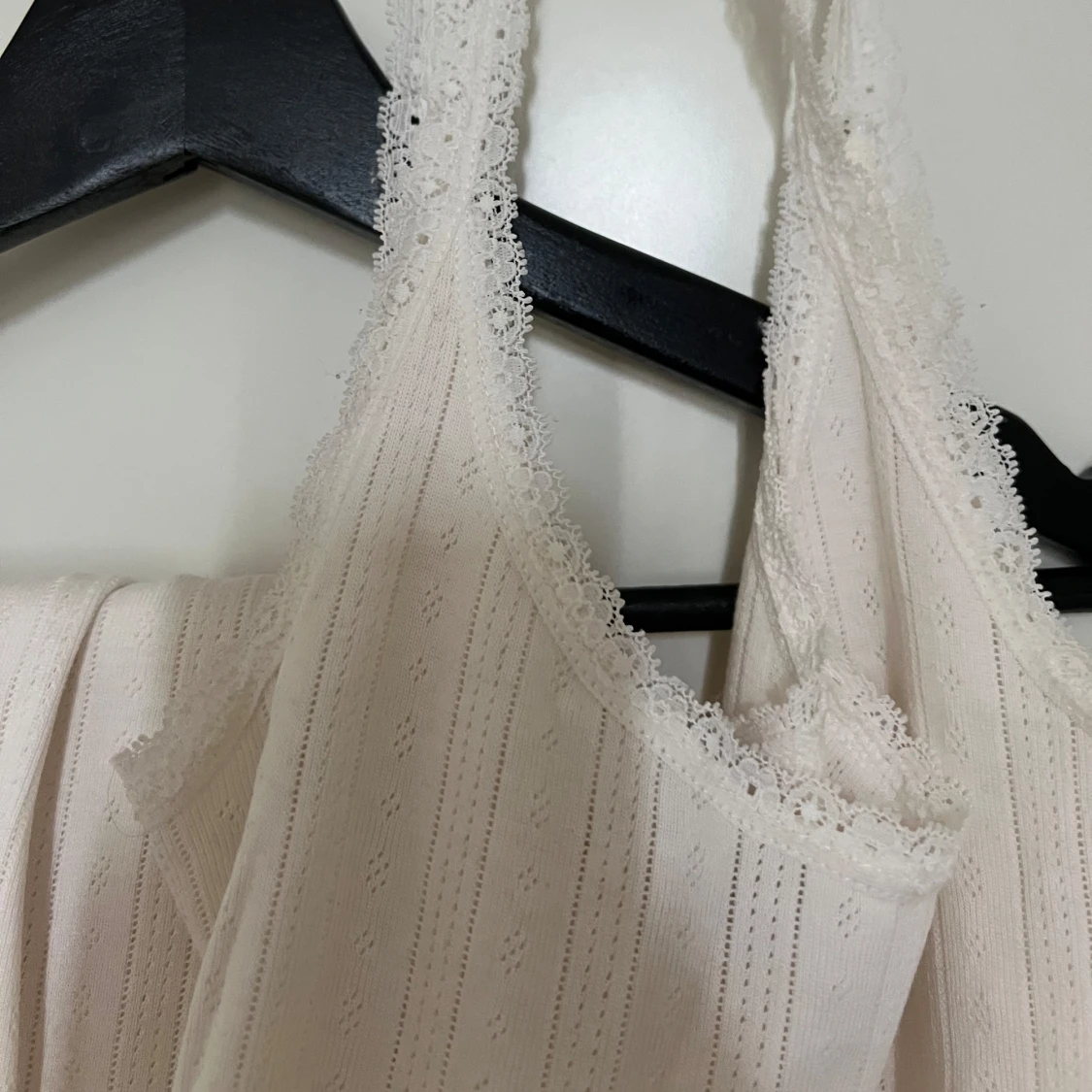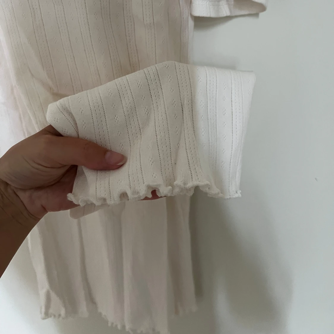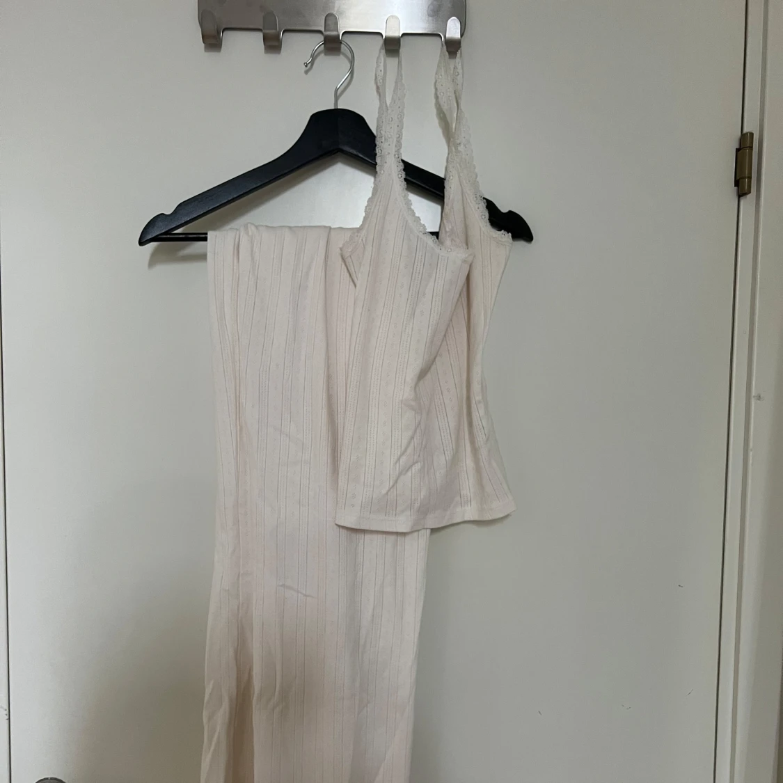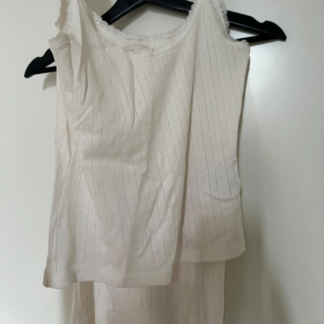 Mjukisset med super söt topp som har en spetsdetalj, och långa byxor med volangkant nedtill
