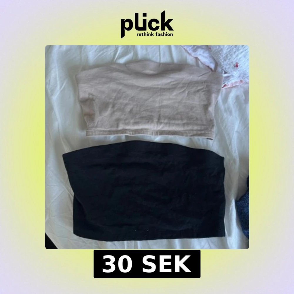 Två bandeau tubtoppar från 157 i storlek XS/S. Ena toppen är beige och den andra är svart, båda i mjuk bomullskänsla. Perfekta att styla under skjortor eller till höga jeans. Säljes som ett set.