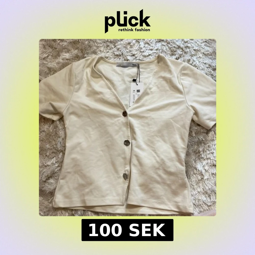 Säljer en stilren beige blus från 157 med korta ärmar och v-ringning. Toppen har tre dekorativa knappar framtill och är gjord i mjuk bomull. Perfekt för en enkel och clean look.