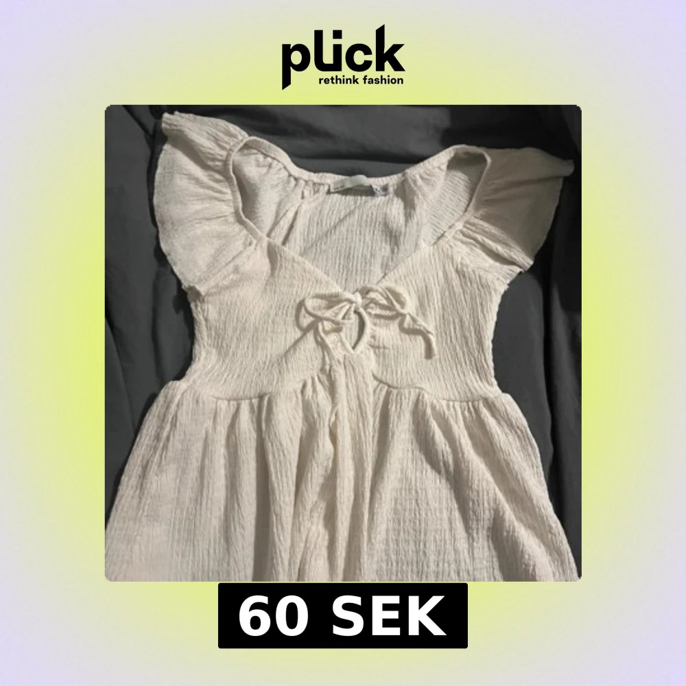 Supersöt vit topp från 157 i crinklat bomullstyg. Klänningen har volangiga korta ärmar, knytning framtill och en luftig, flowy passform. Perfekt för varma dagar och ger en romantisk vibe.