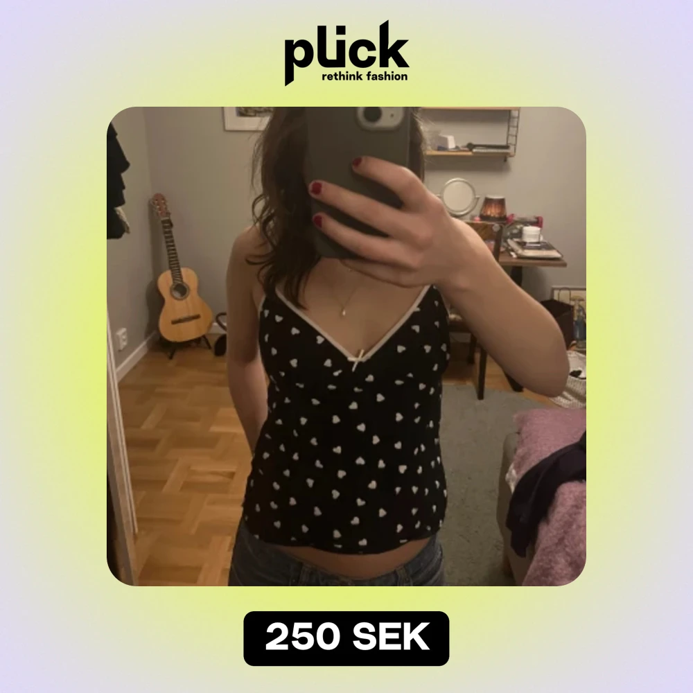 Svart linne med vita hjärtan. Så gulligt och toppskick! Det står storlek L men den sitter som XS
