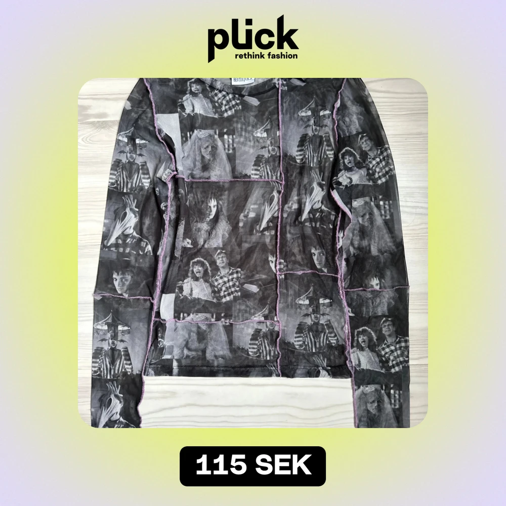 Cool långärmad mesh tröja från Pull&Bear med Beetlejuice-motiv. Den har ett olika svartvita mönster med scener från filmen och sömmar i lila. Den är ganska genomskinlig så den är bra att ha över/under en annan top. Skriv gärna om du är intresserad innan du köper! 🫶