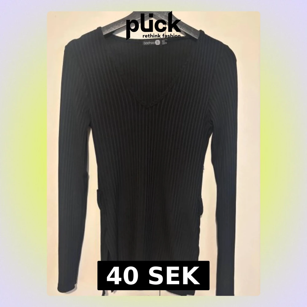 Svart ribbad långärmad topp med V-ringning. Mjuk och stretchig passform. Har slits vid sidan om. Bra skick.