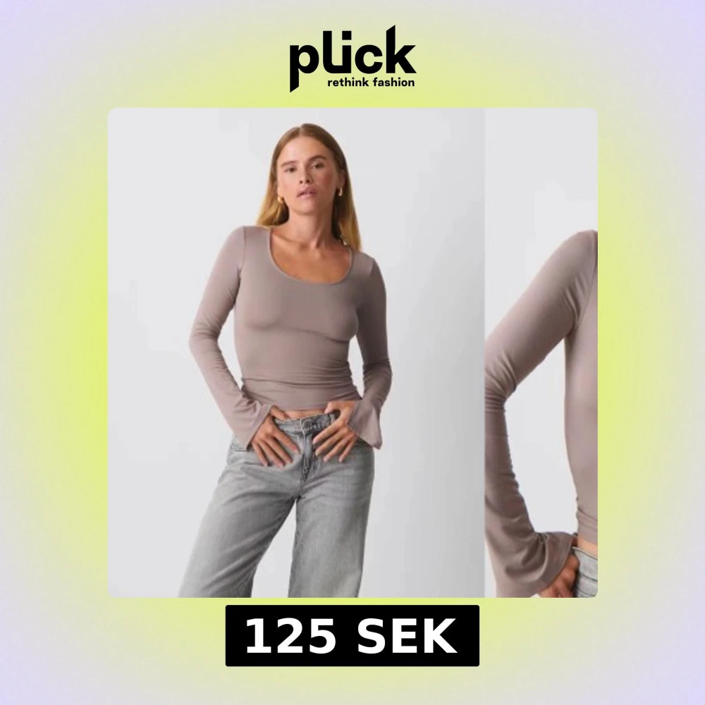 Supersnygg beige långärmad topp från ginatricot med utsvängda ärmslut och rundad urringning. Sitter tight och har en clean, minimalistisk vibe i strl XS. Perfekt att styla med tex jeans för en chill look. Orginalpris: 200kr
